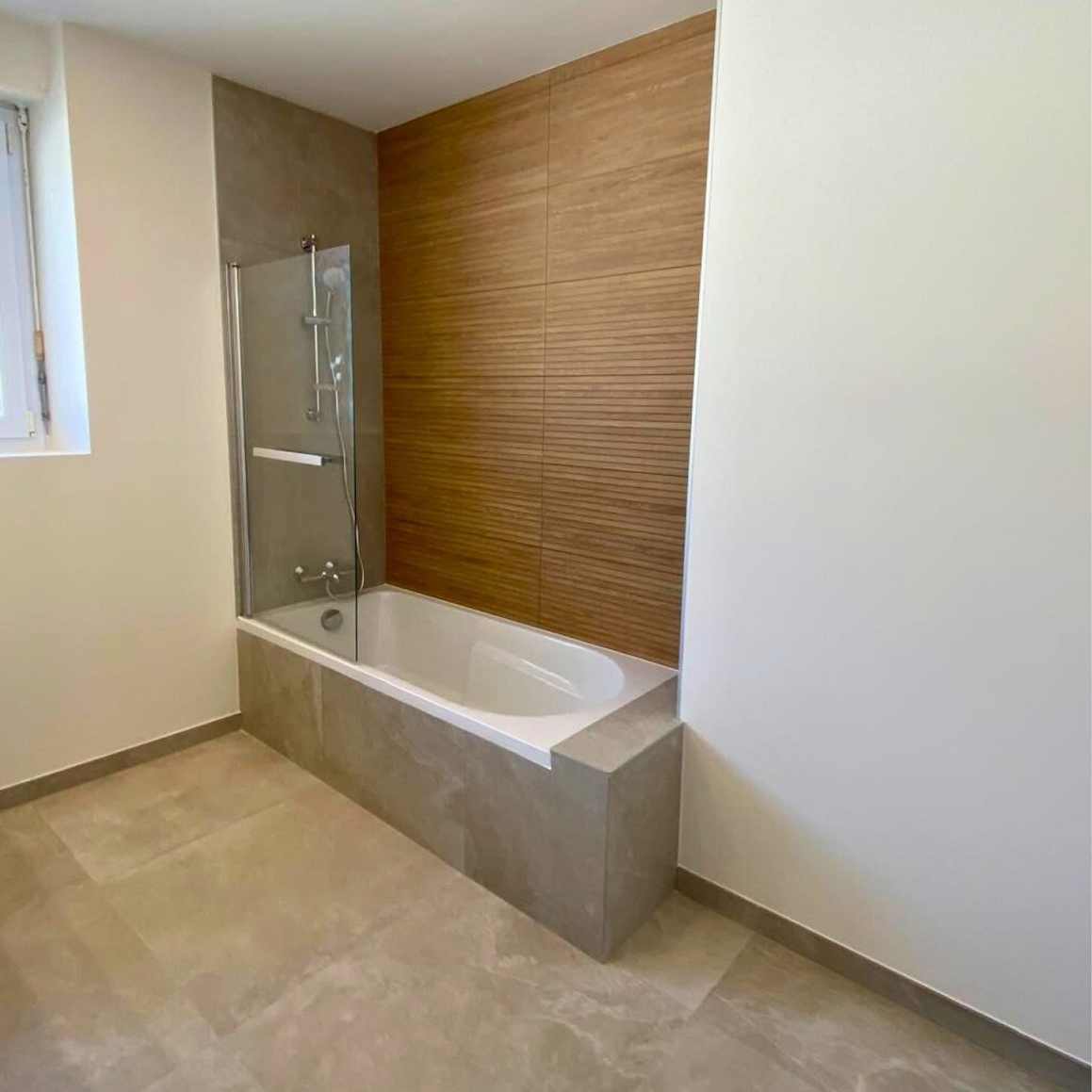 - L’habillage de la baignoire a été réalisé avec la faïence Peronda de la gamme VERBIER WALL aux dimensions de 33,3x100cm.