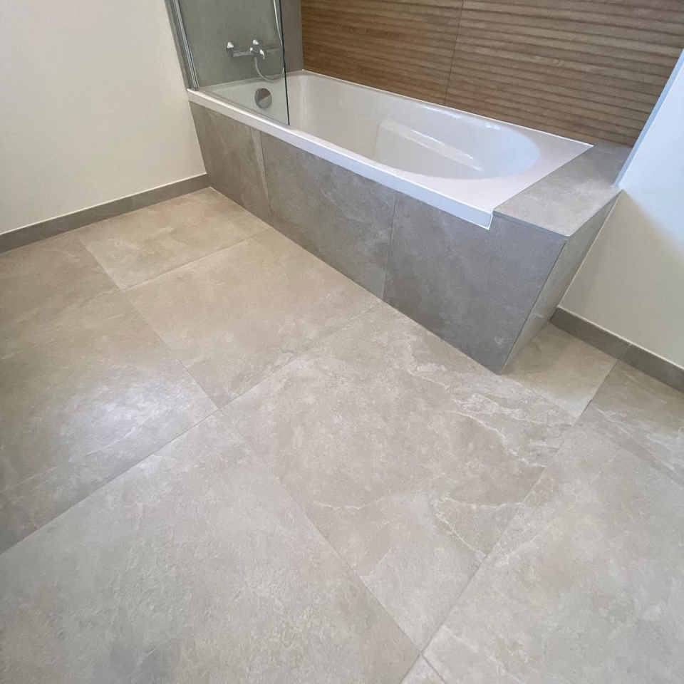 - Les murs et le sol ont été habillé d’un grès cérame de la marque Ragno, en teinte Shell issue de la collection REALSTONE SLATE provenant de chez Point P
