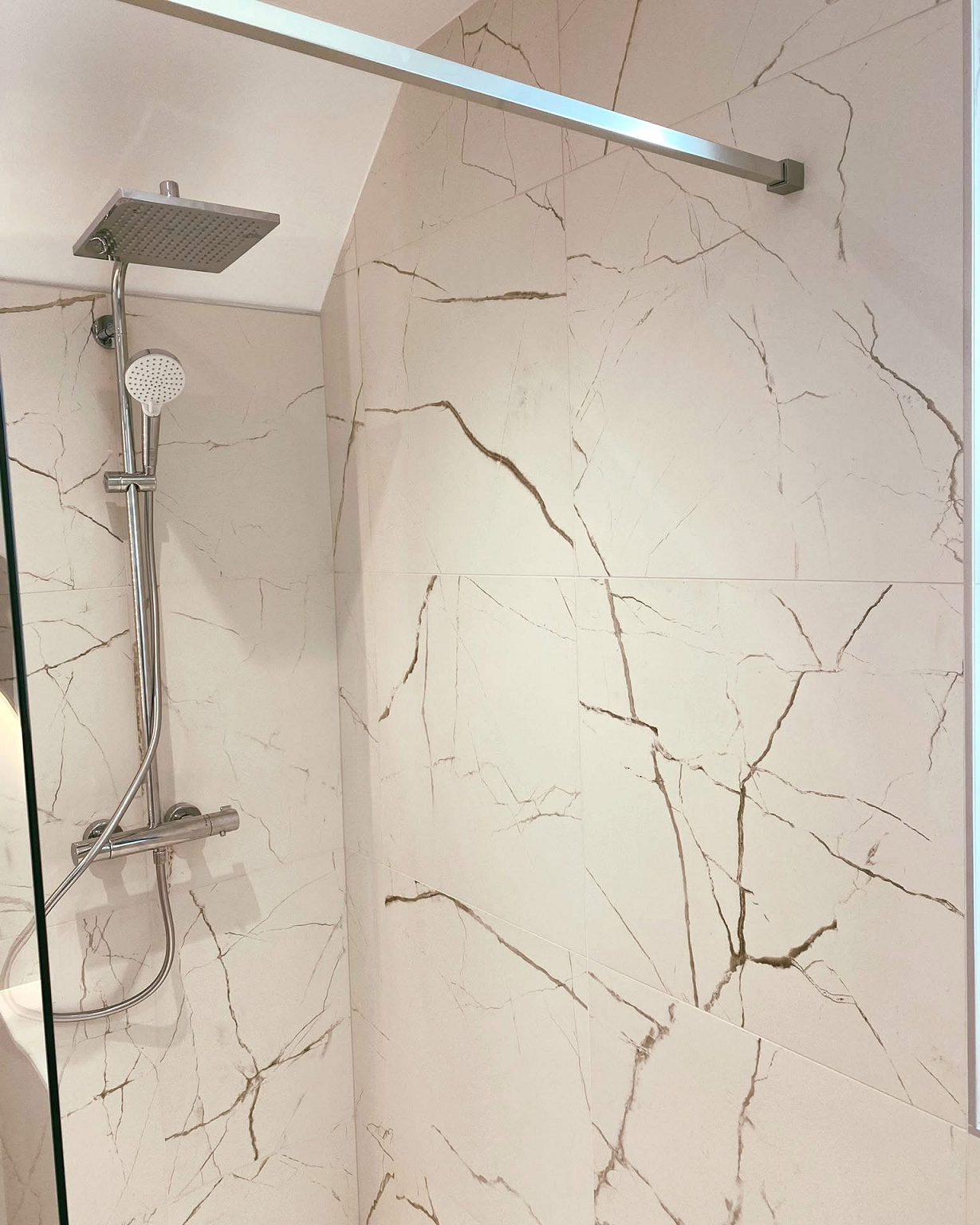 • Pose d’un receveur de douche de la marque Mcbath aux dimensions 210*90 cm de la gamme Centuria Slate Nox en teinte blanche.