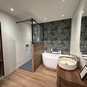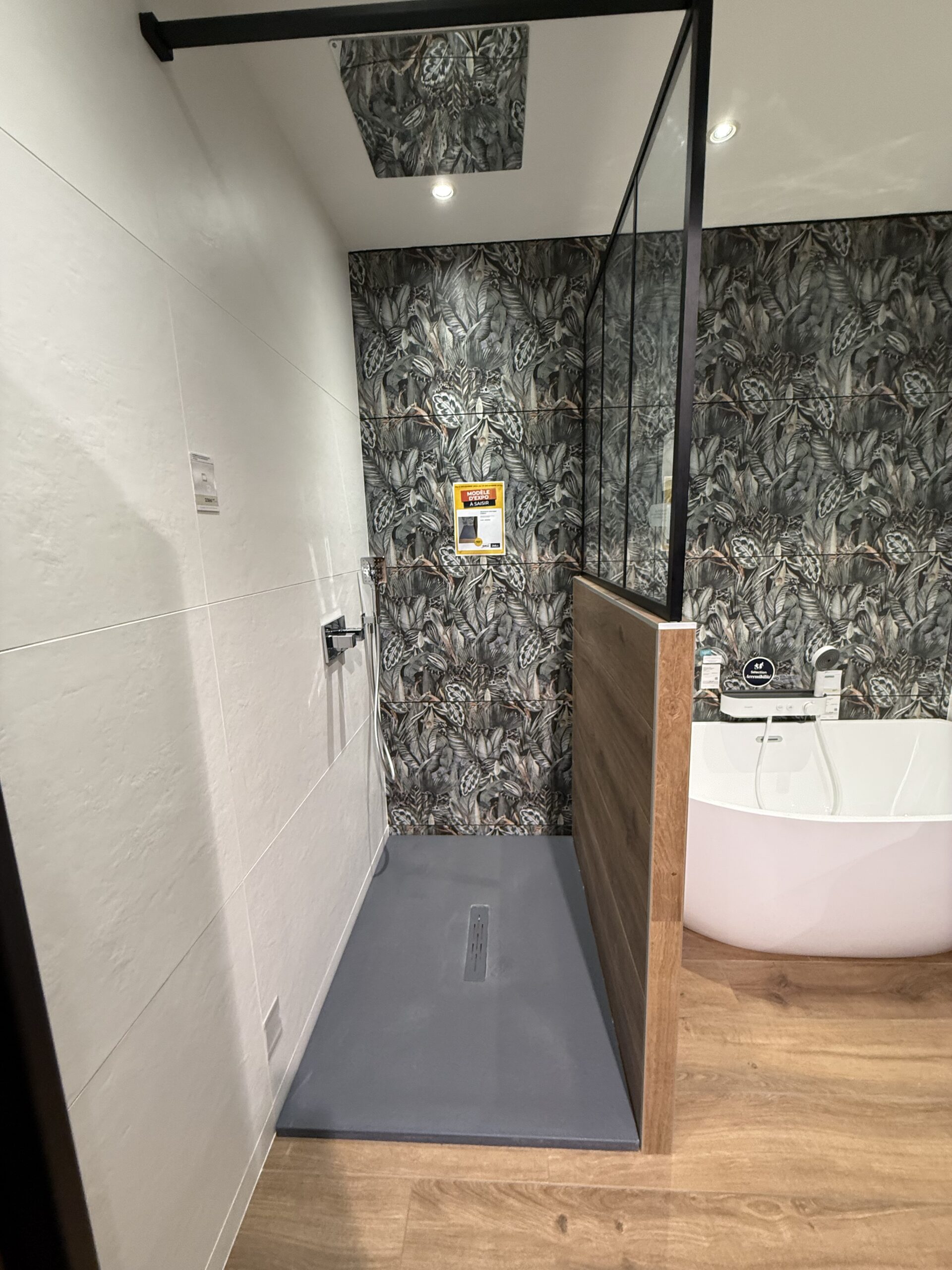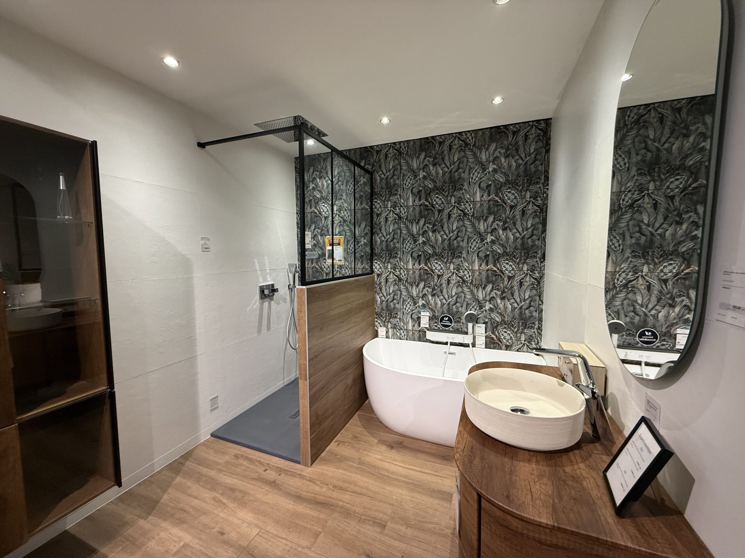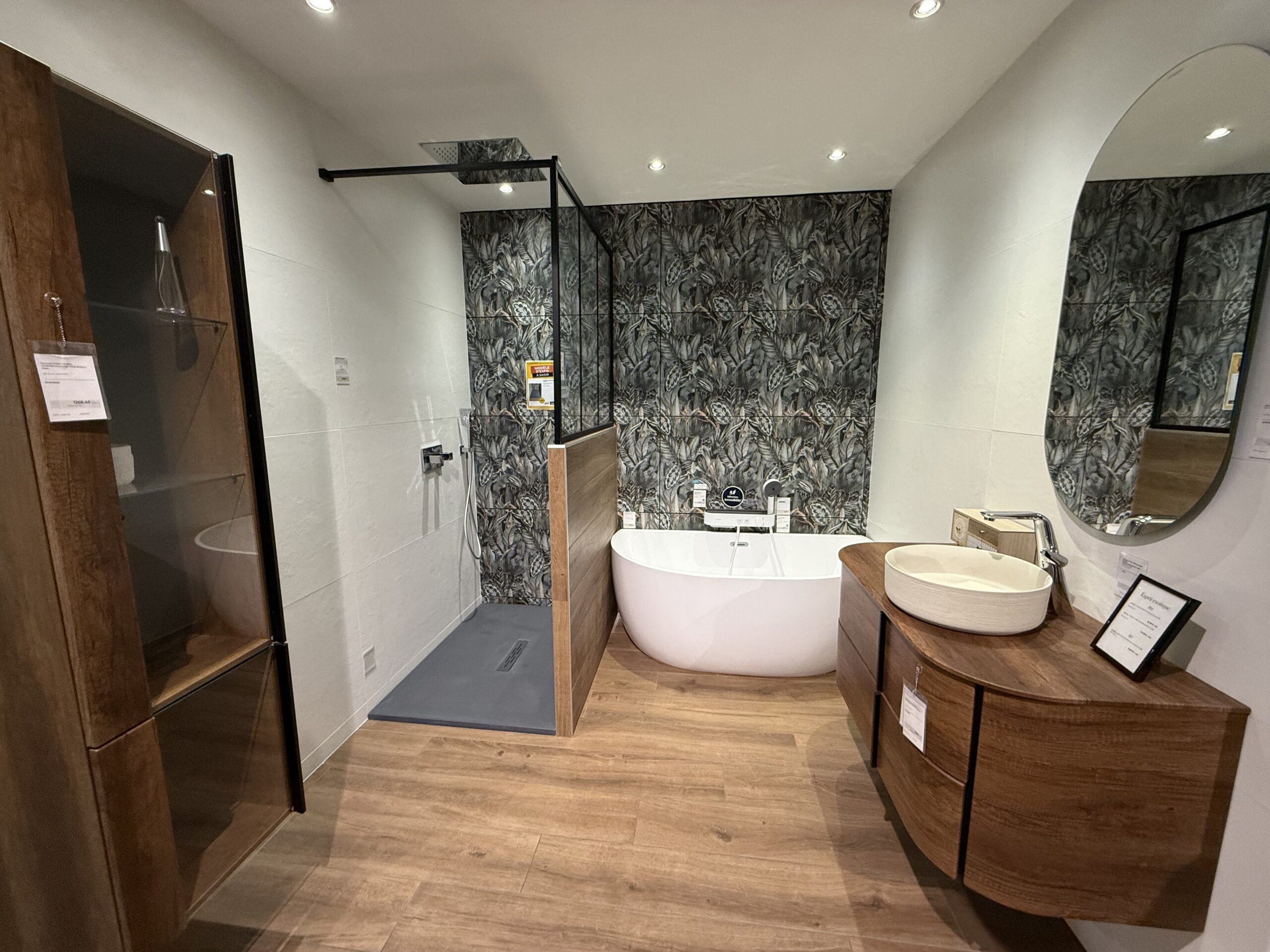 Notre entité Les Salles de bains d’Inès a procédé à la réalisation d’une salle de bain d’exposition sur le thème exotique dans le showroom Cedeo/Point P se trouvant sur la commune de Lorient.
