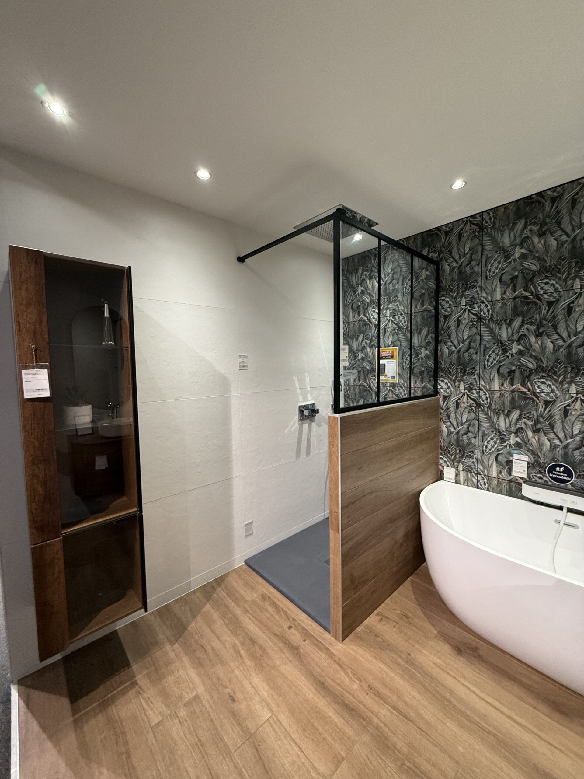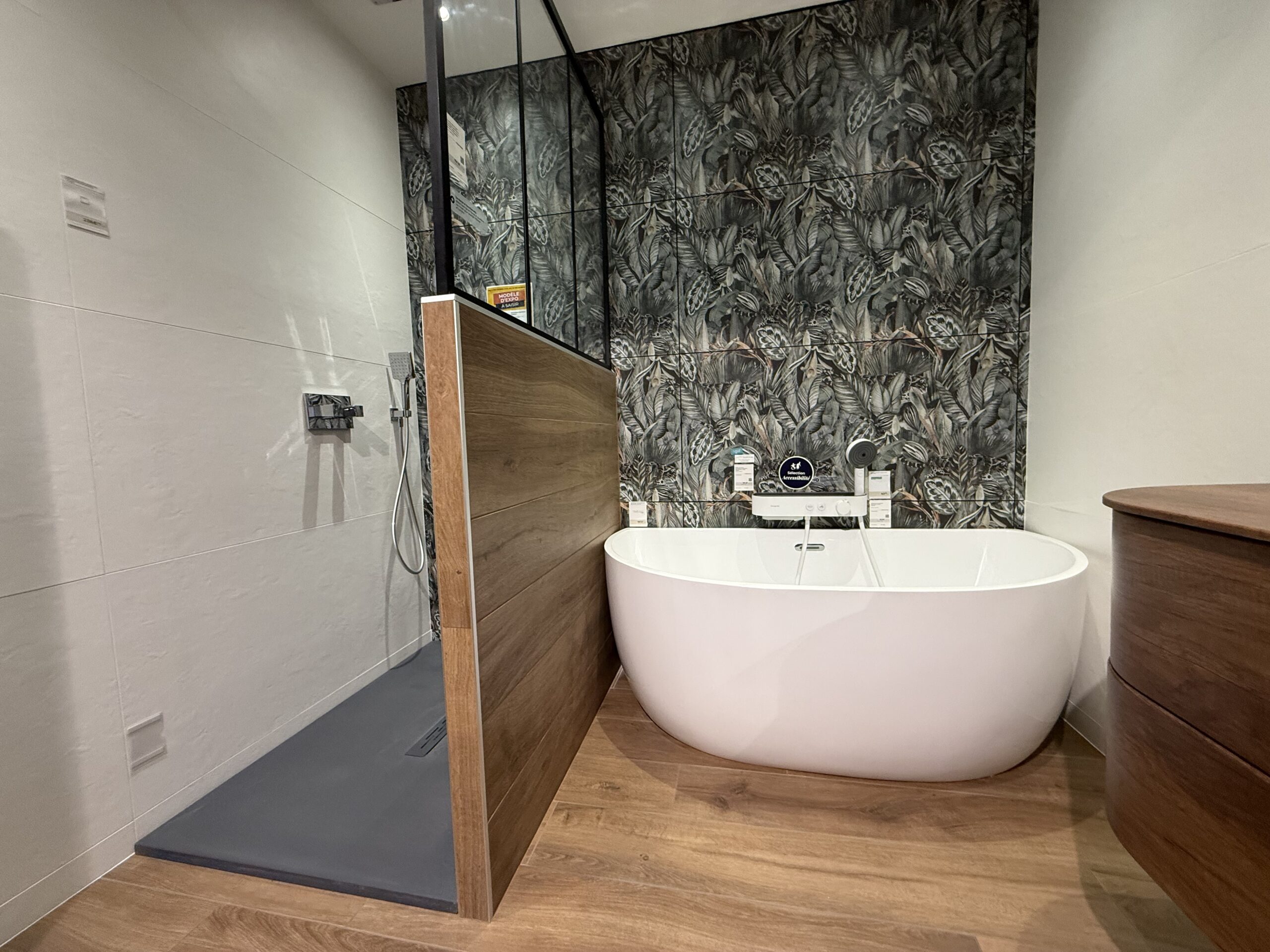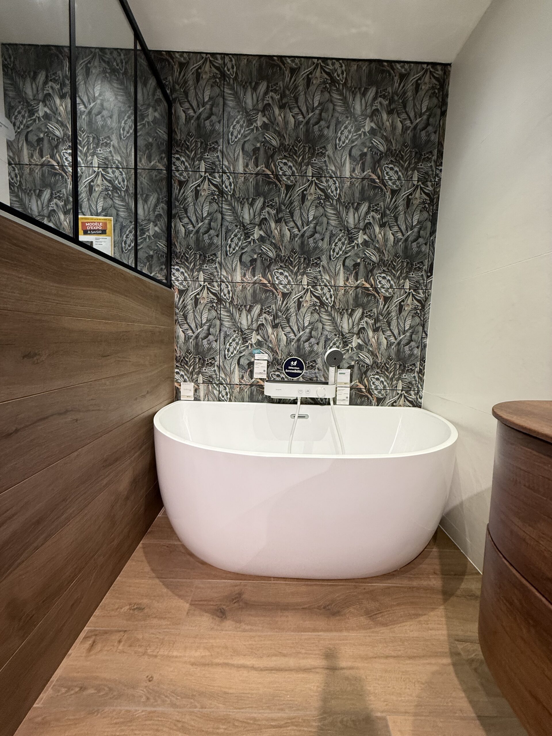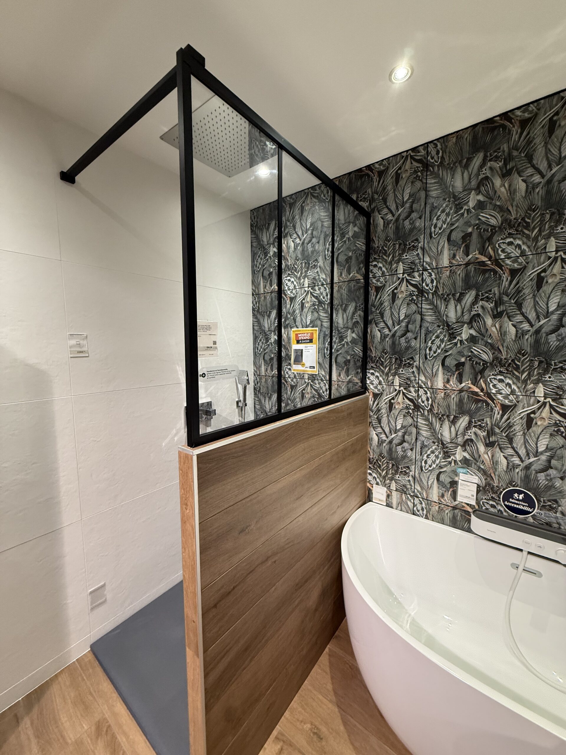 Notre entité Les Salles de bains d’Inès a procédé à la réalisation d’une salle de bain d’exposition sur le thème exotique dans le showroom Cedeo/Point P se trouvant sur la commune de Lorient.