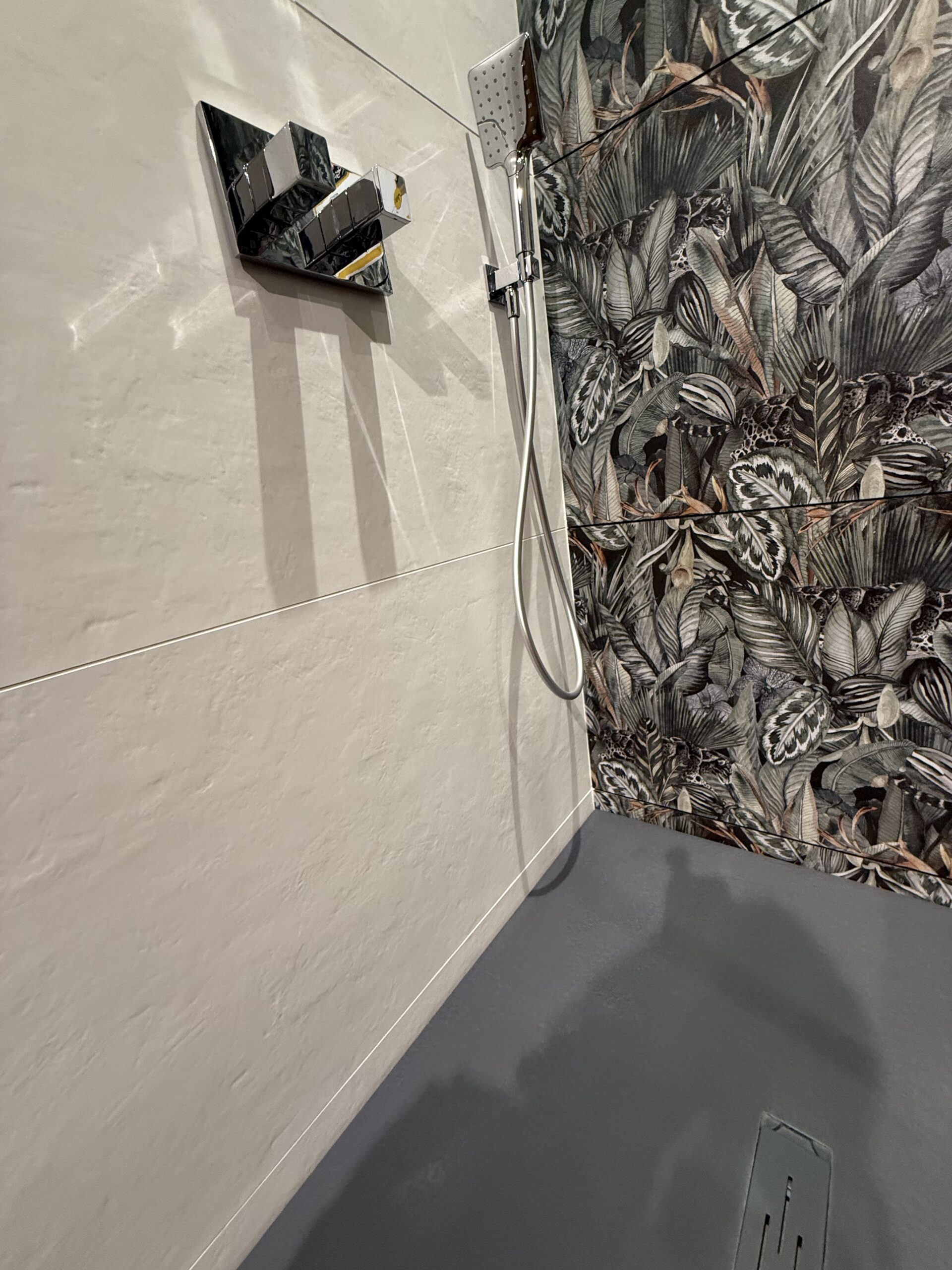 - L’installation d’un ensemble de douche encastré avec pomme de tête, douchette et mitigeur de chez Ondyna