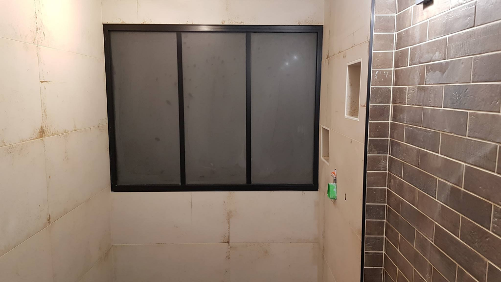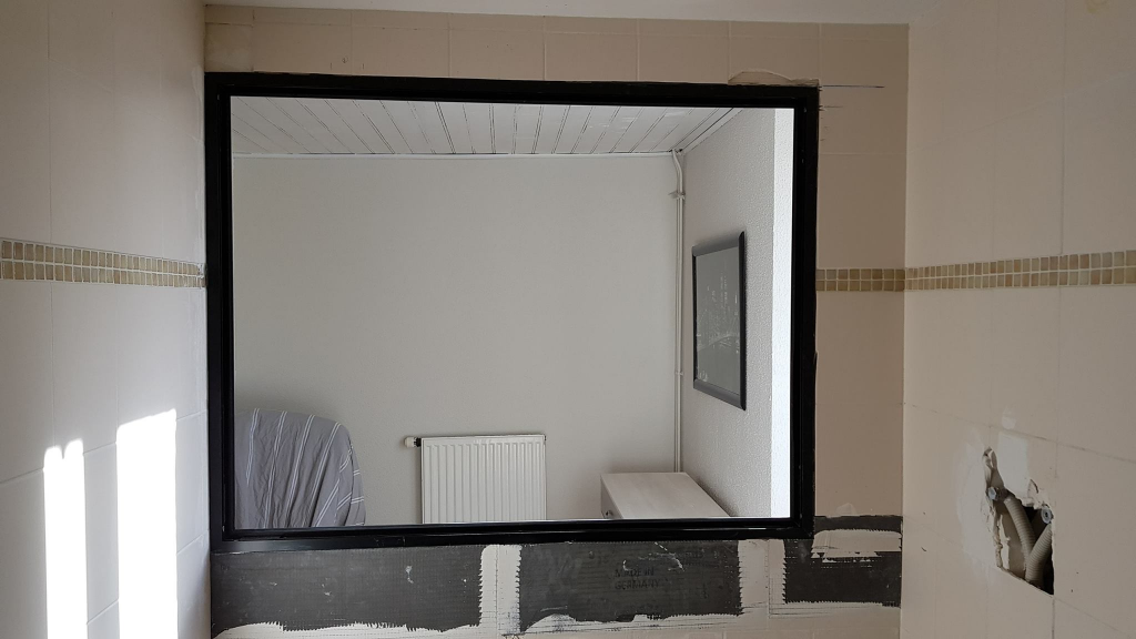 • La pose d’une verrière Glass solution 130 x 100 cm verre Securit 8 mm sablé
