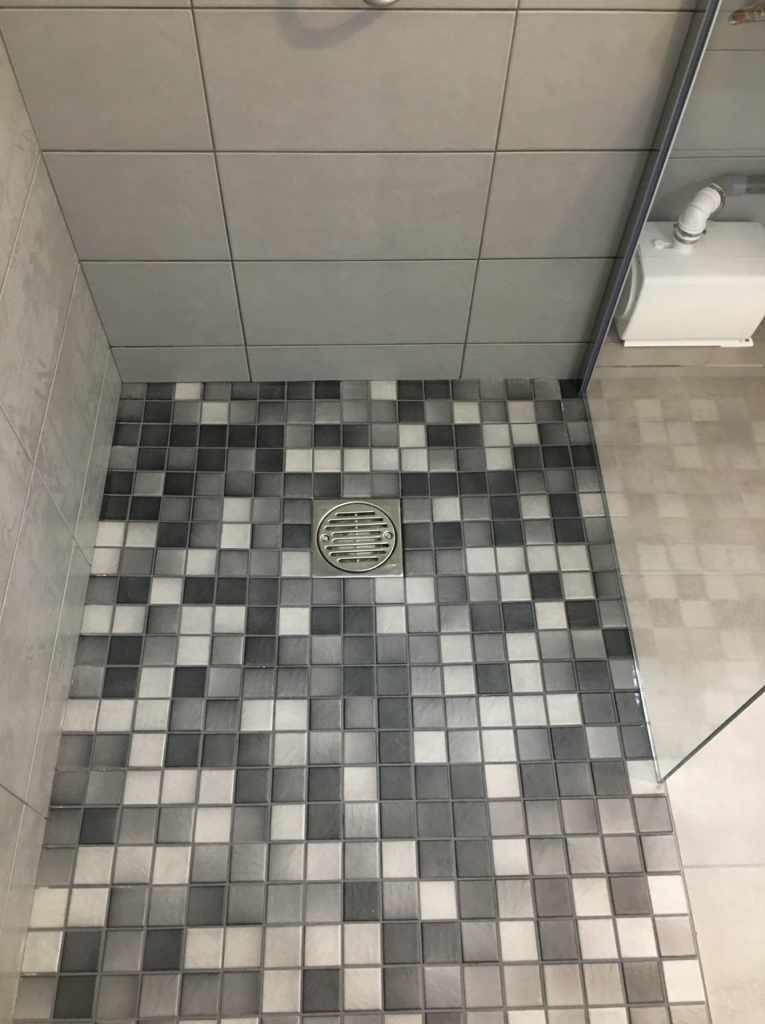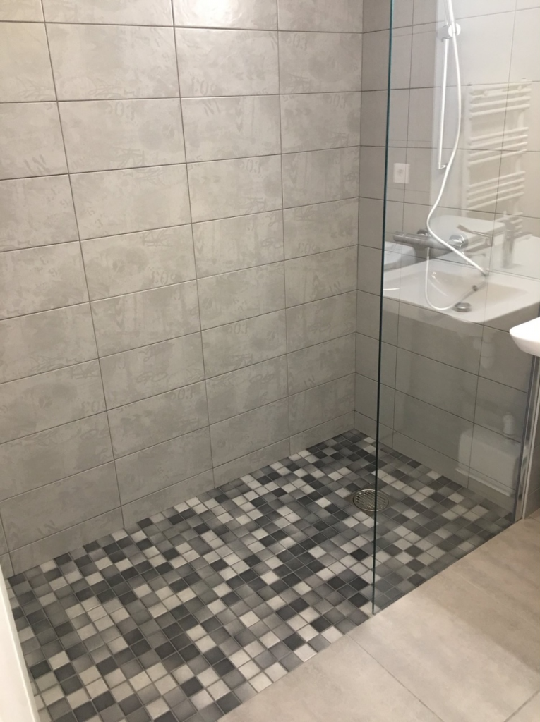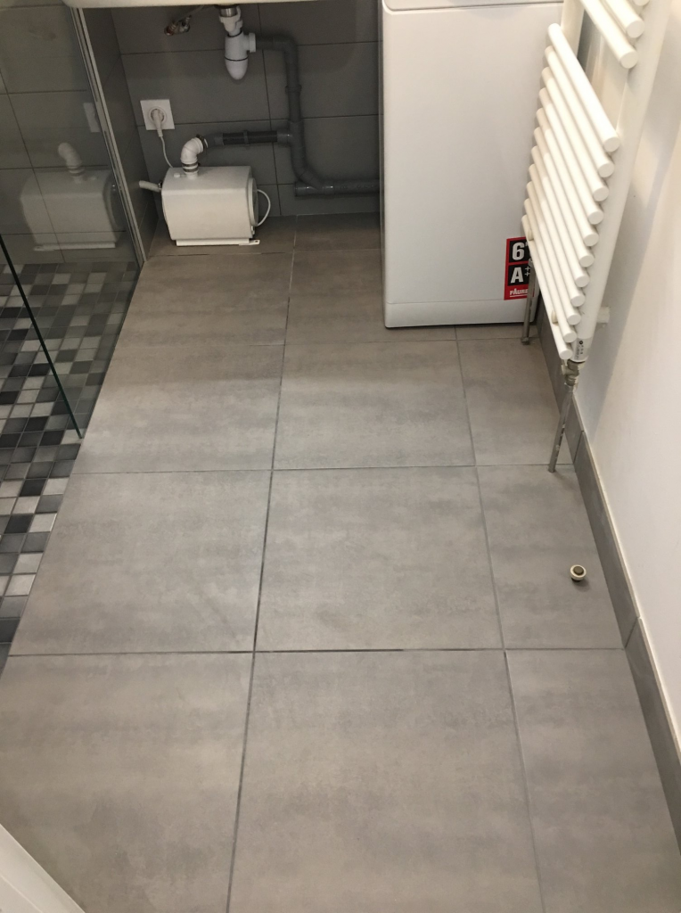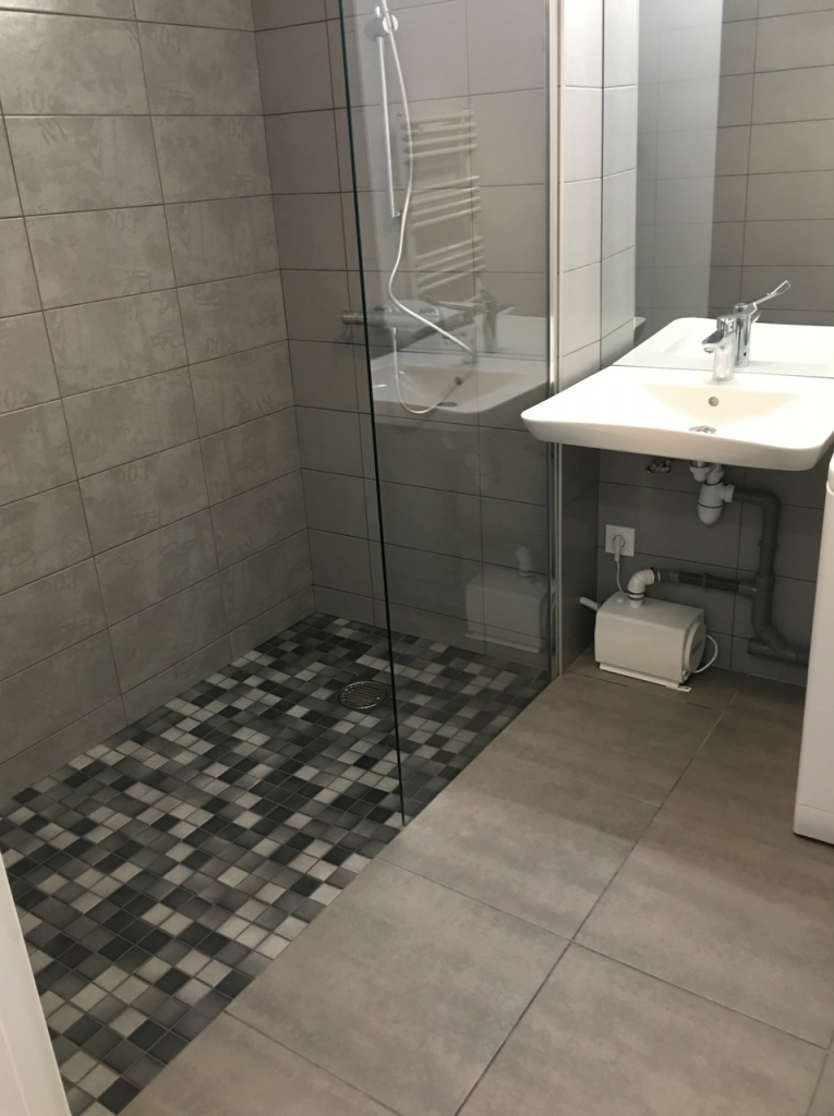 La subtilité d’une douche à l’italienne dans un appartement situé au 1er étage et la mise en place d’une pompe de relevage encastrée dans le siphon de douche.