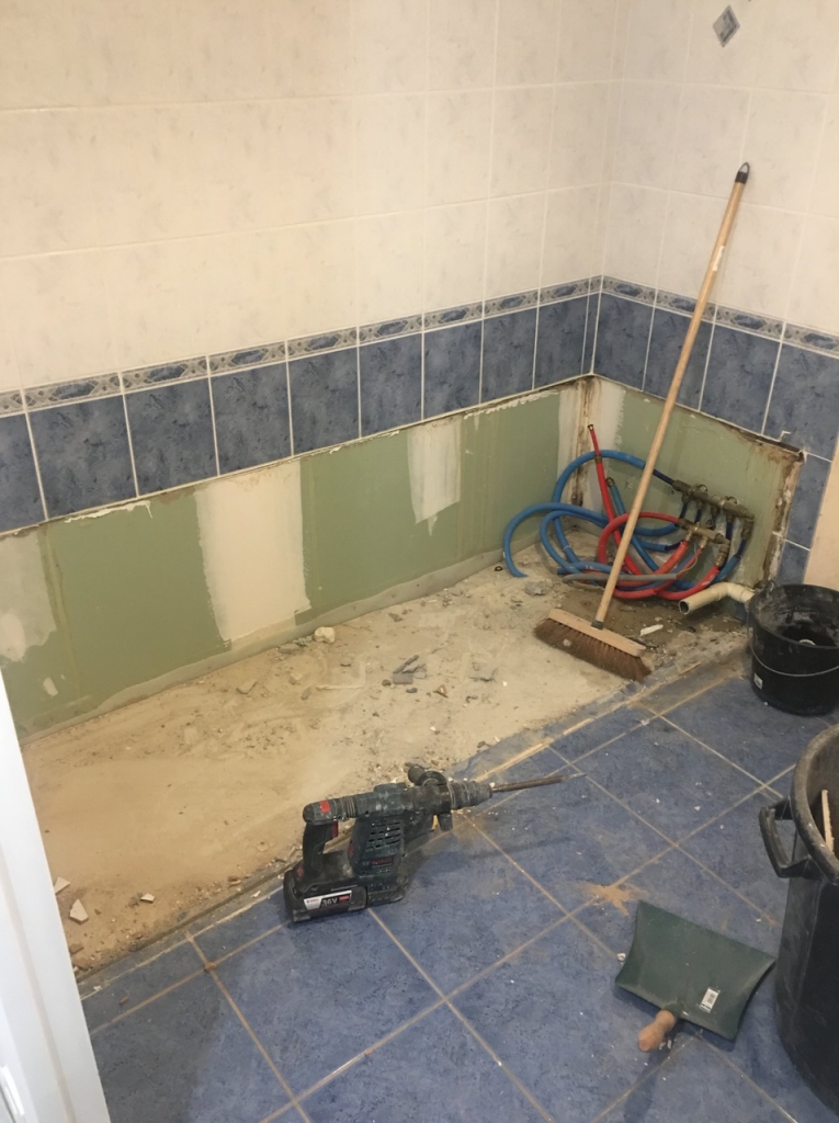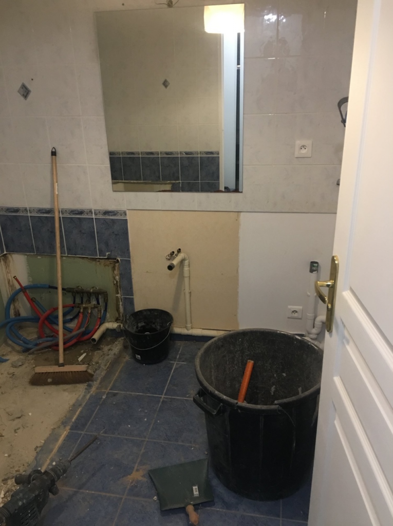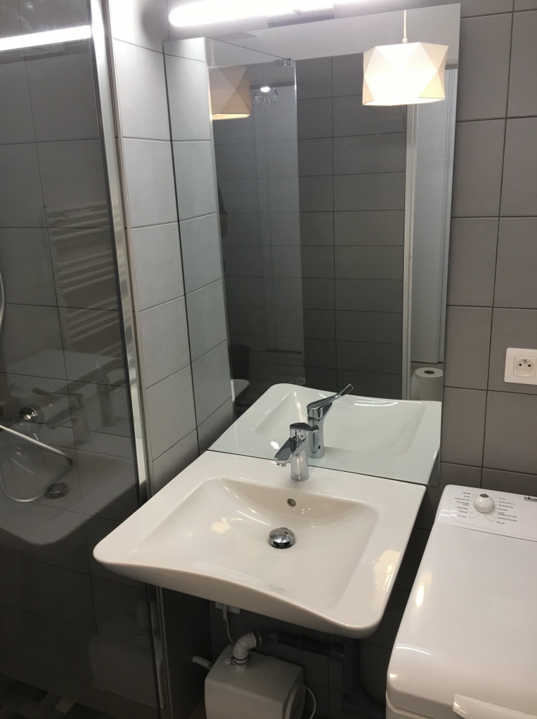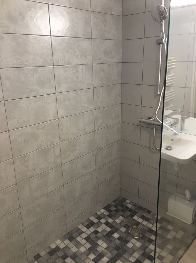 La subtilité d’une douche à l’italienne dans un appartement situé au 1er étage et la mise en place d’une pompe de relevage encastrée dans le siphon de douche.
