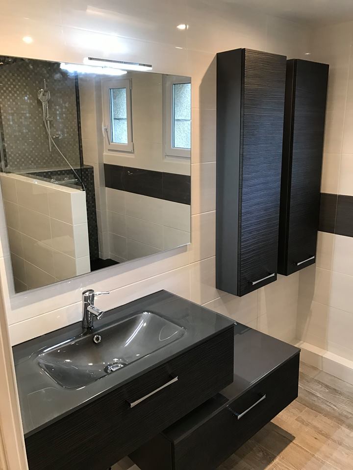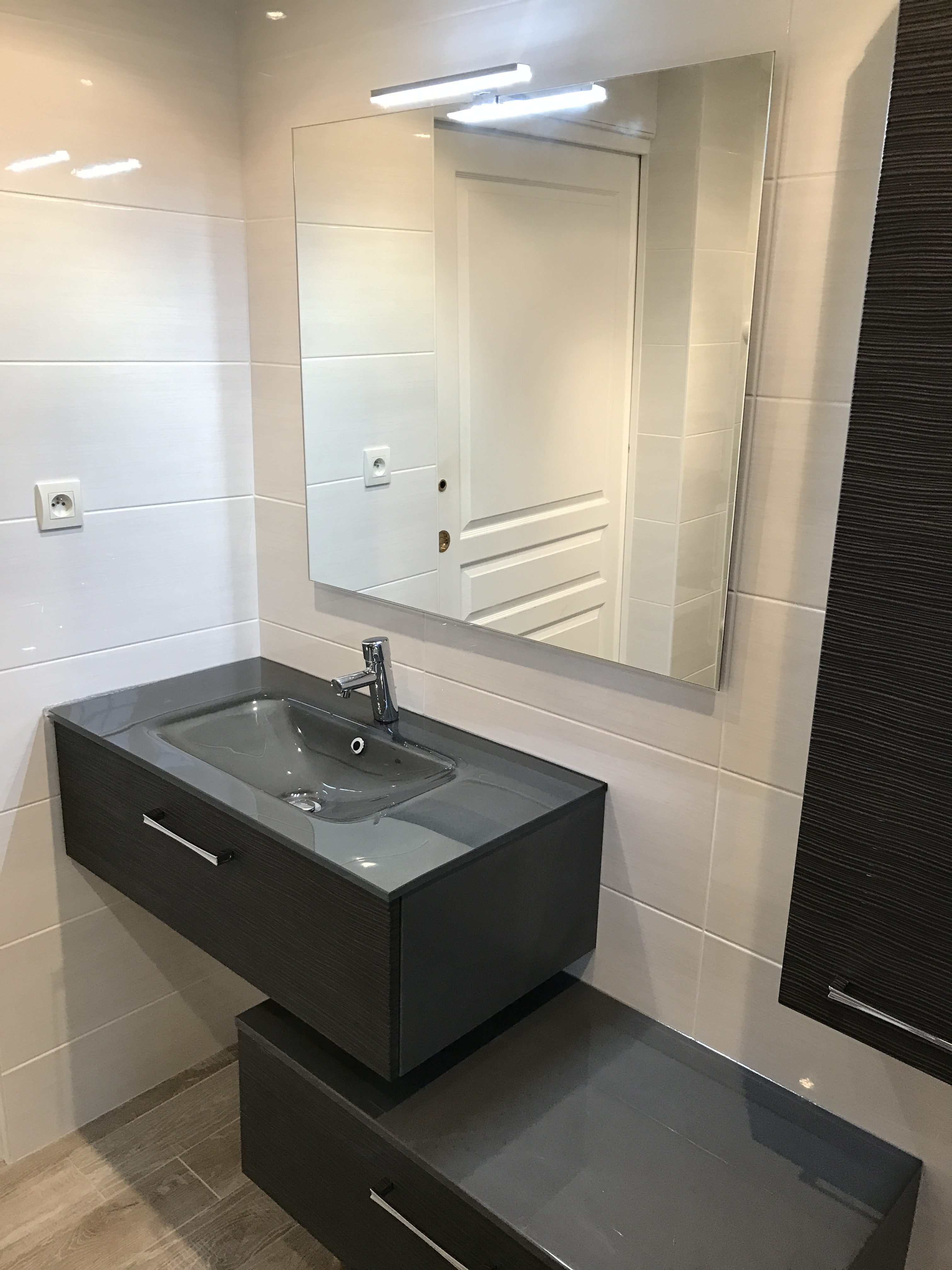 - La pose du carrelage « Iris Madeira grigio » 15×90 cm