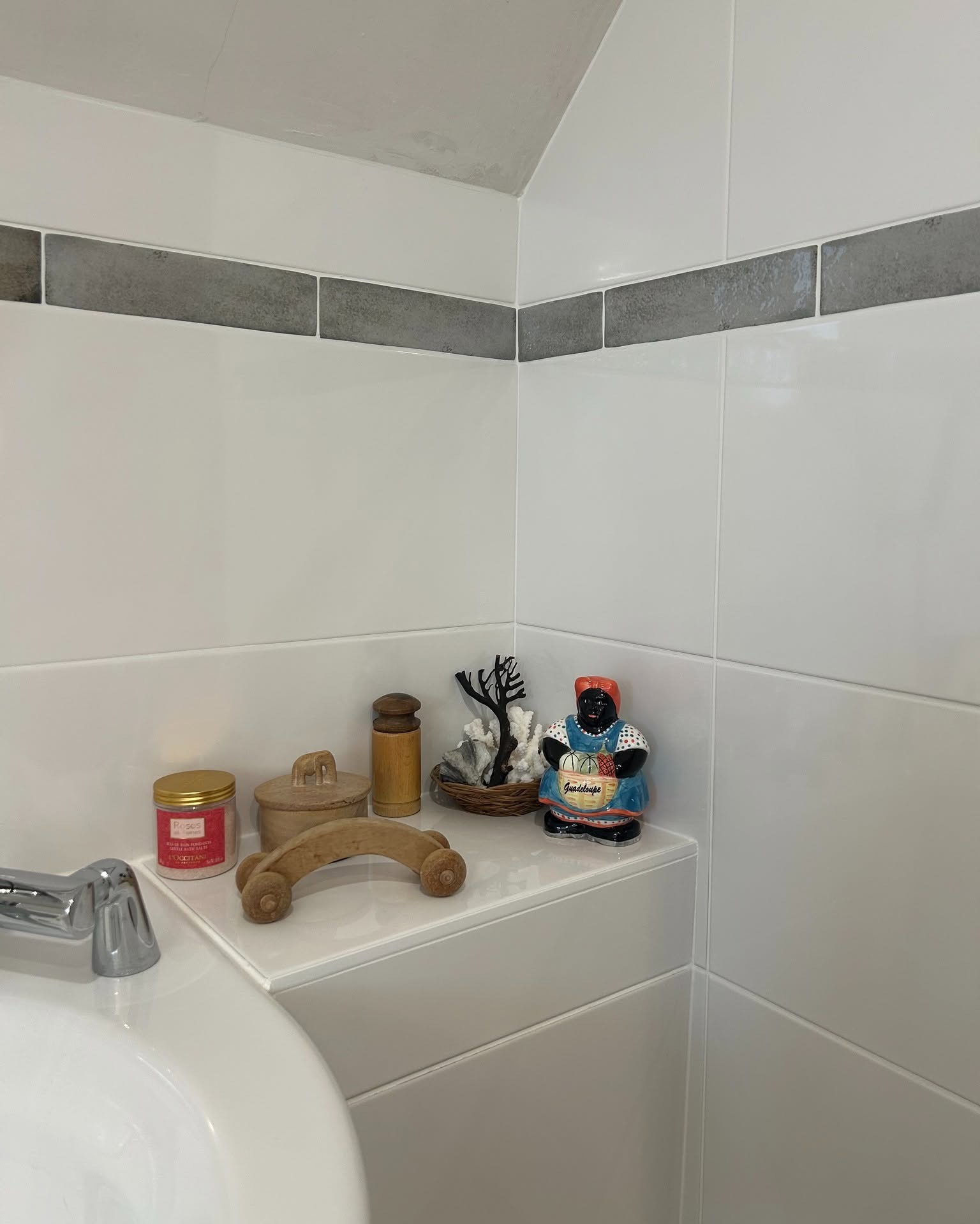 - La pose au mur d’une faïence Arte Deco/ Twist Evolution en 30*60 cm accompagnée d’un listel Legacy 6*25 cm de chez Harmony inspire.