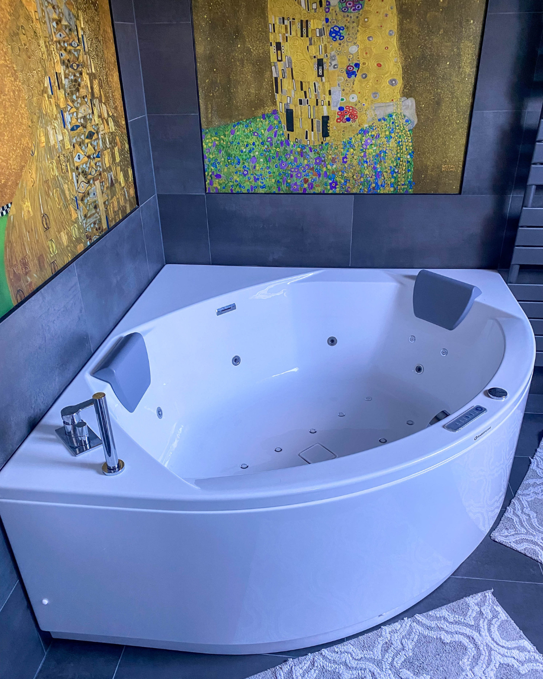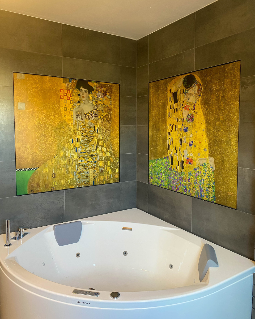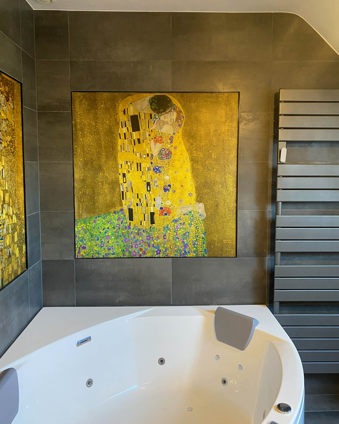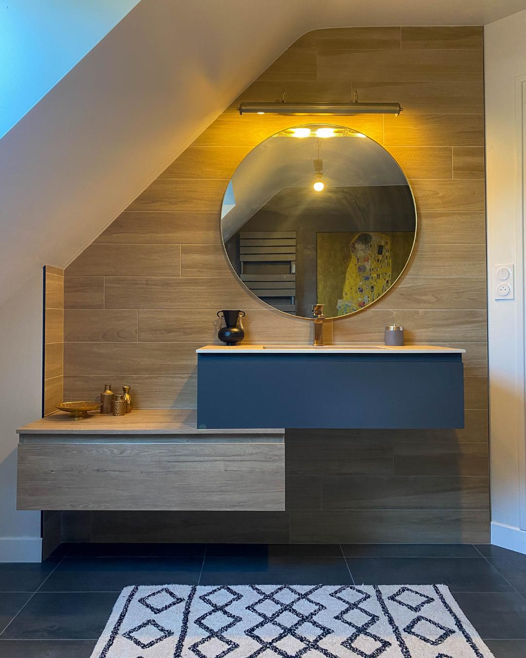 Dans cette salle de bains, les matériaux raffinés et les nuances intenses composent une ambiance à la fois chaleureuse et sophistiquée. Les panneaux décoratifs, empruntant leur éclat à l’univers doré de Klimt, offrent une signature artistique singulière.