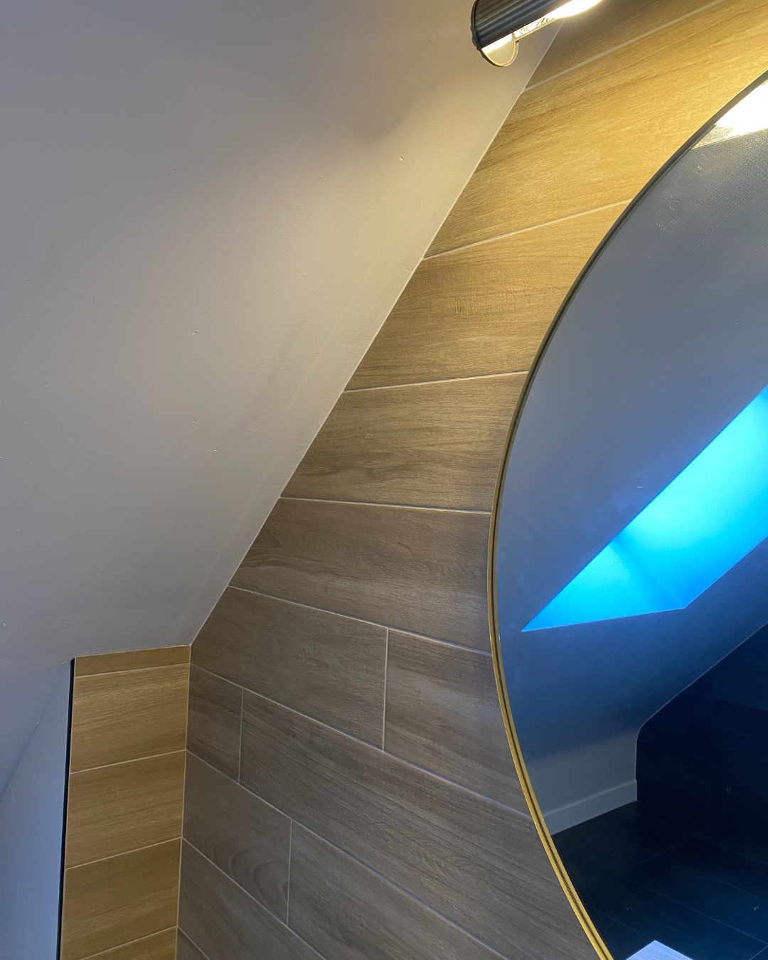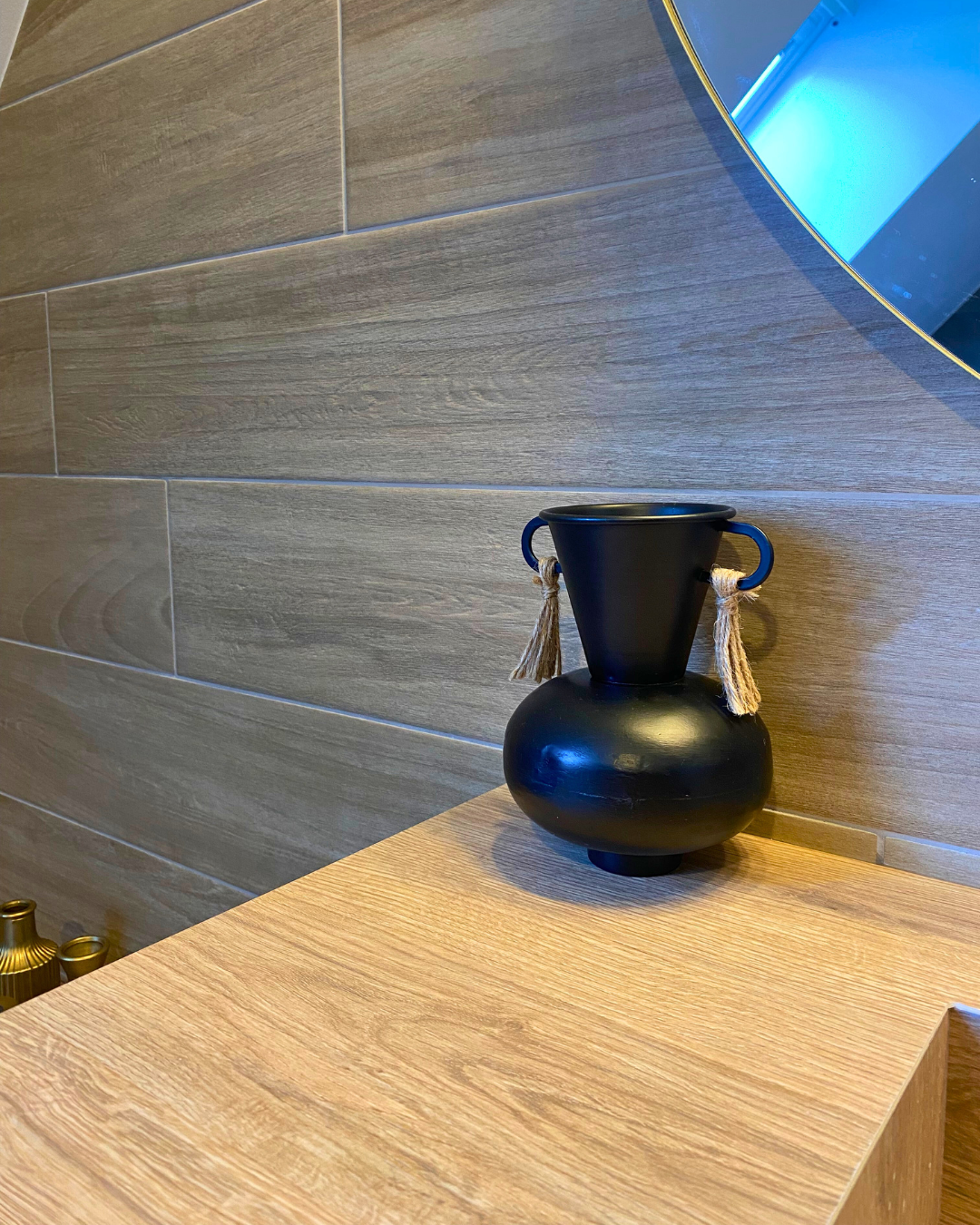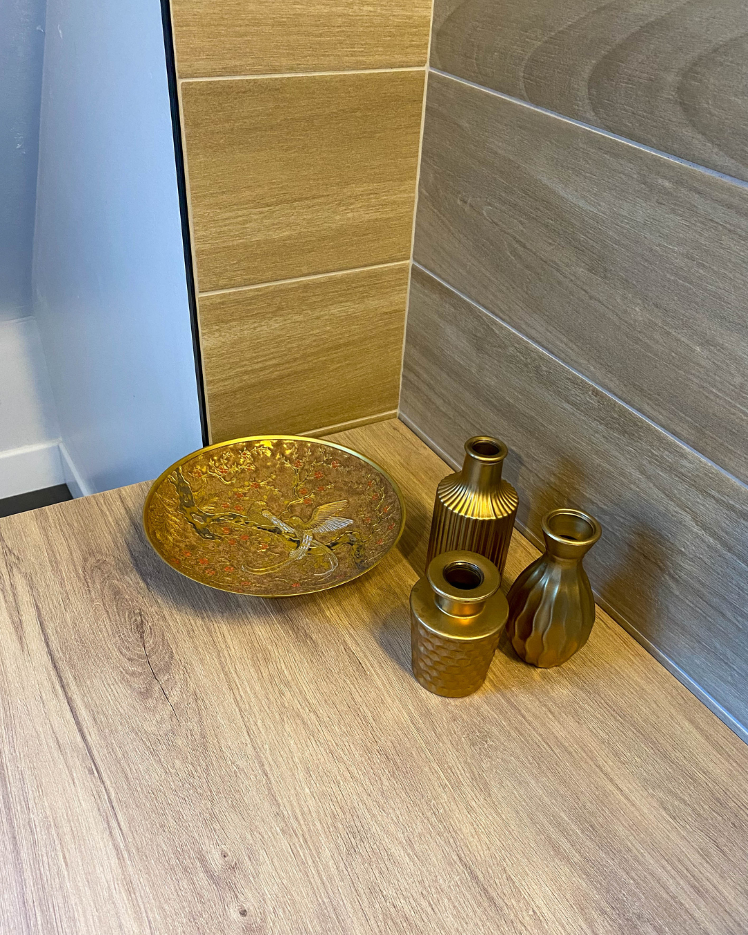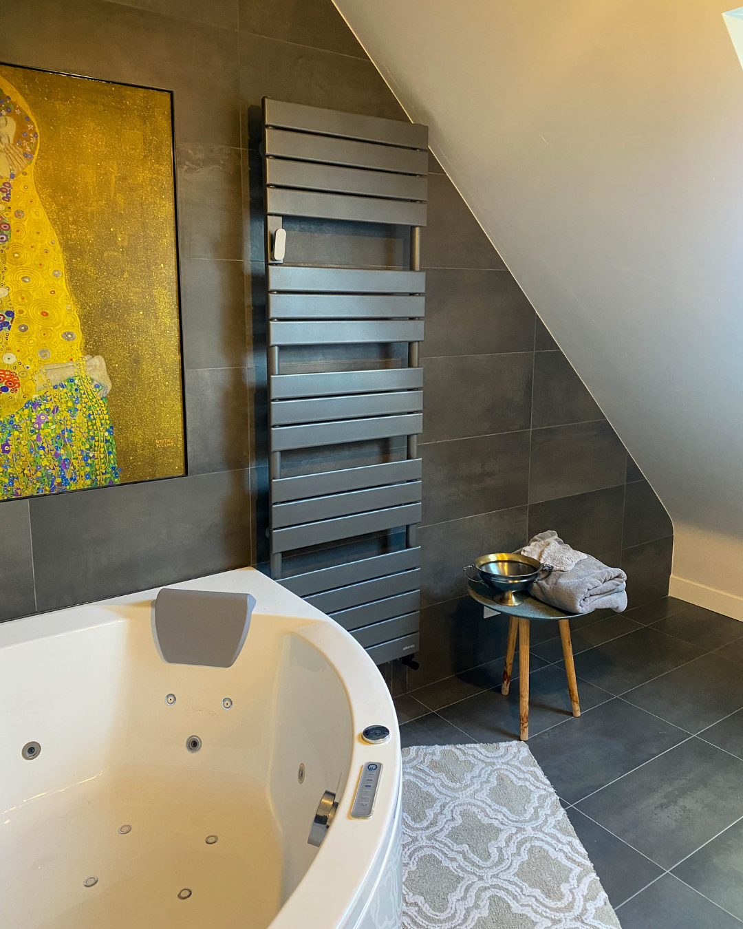 Dans cette salle de bains, les matériaux raffinés et les nuances intenses composent une ambiance à la fois chaleureuse et sophistiquée. Les panneaux décoratifs, empruntant leur éclat à l’univers doré de Klimt, offrent une signature artistique singulière.