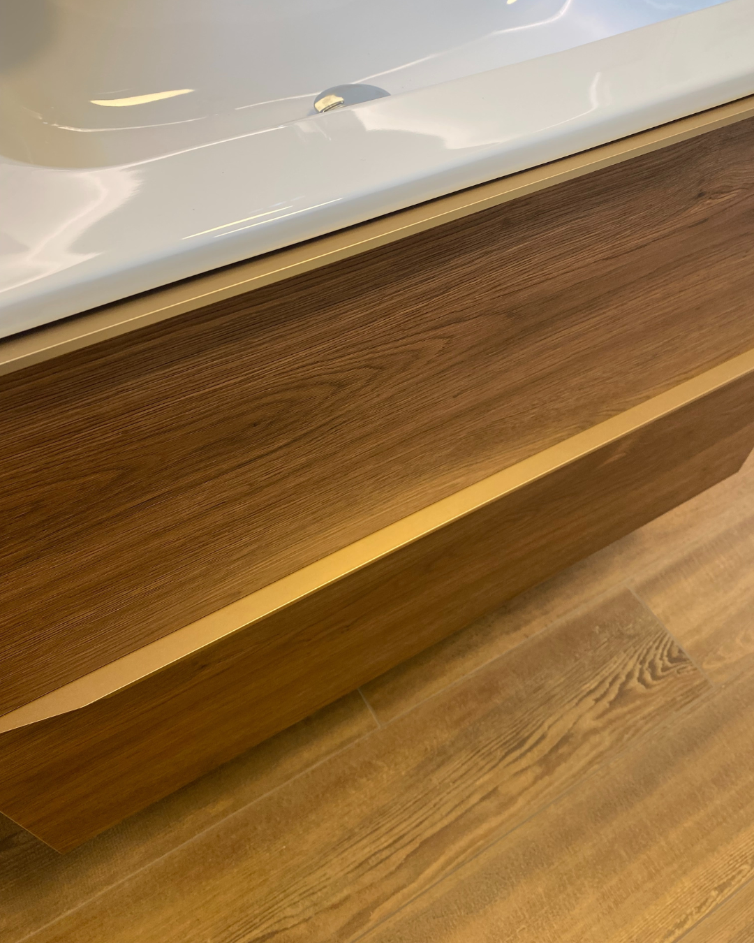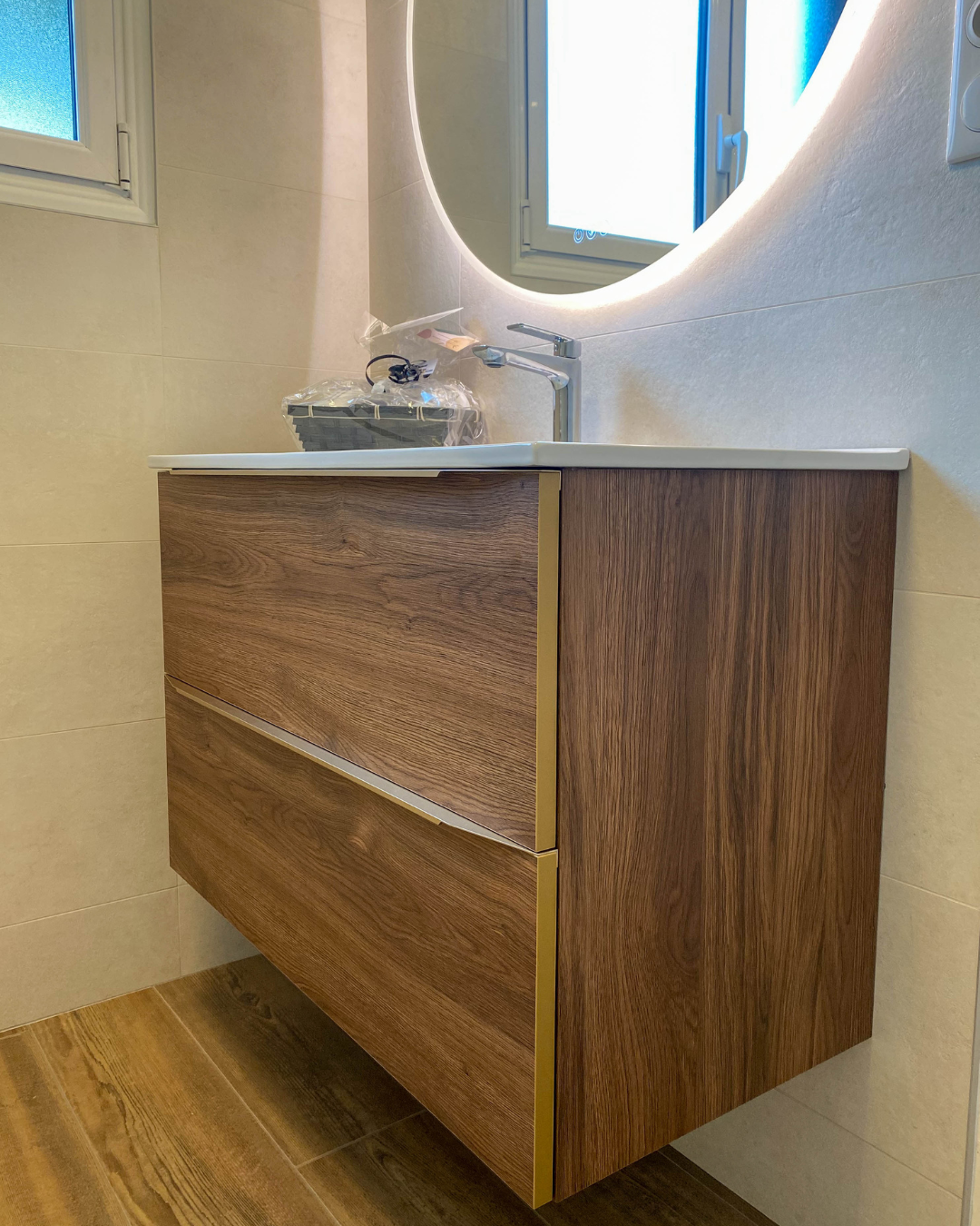 - La pose d’un meuble sous vasque 2 tiroirs Alterna – Gamme Plénitude – Coloris Chêne noisette 90 cm