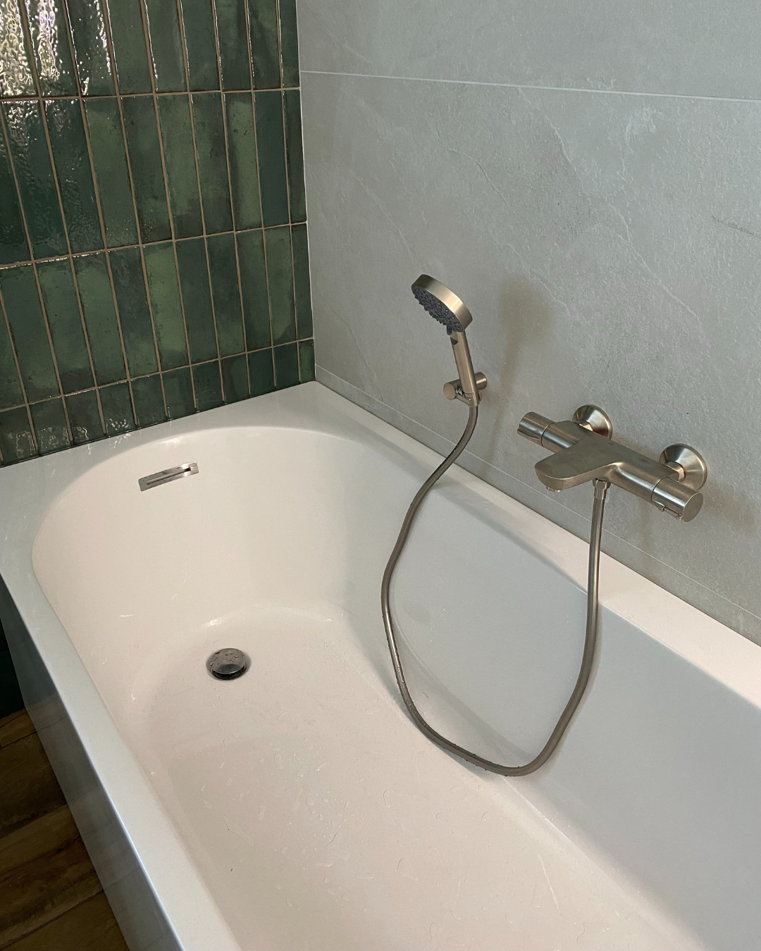 • La pose d’une faïence Arte Deco, de la gamme Opaline en teinte émeraude 6*25 cm