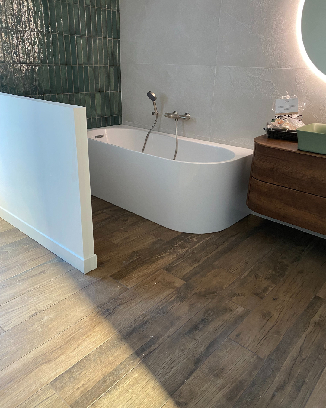 • La pose d’un grès cérame de la marque Ragno, de la gamme Woodmania en teinte caramel 20*120 cm