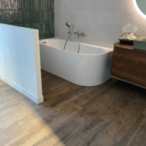 - La pose d’un grès cérame de la marque Ragno, de la gamme Woodmania en teinte caramel 20*120 cm