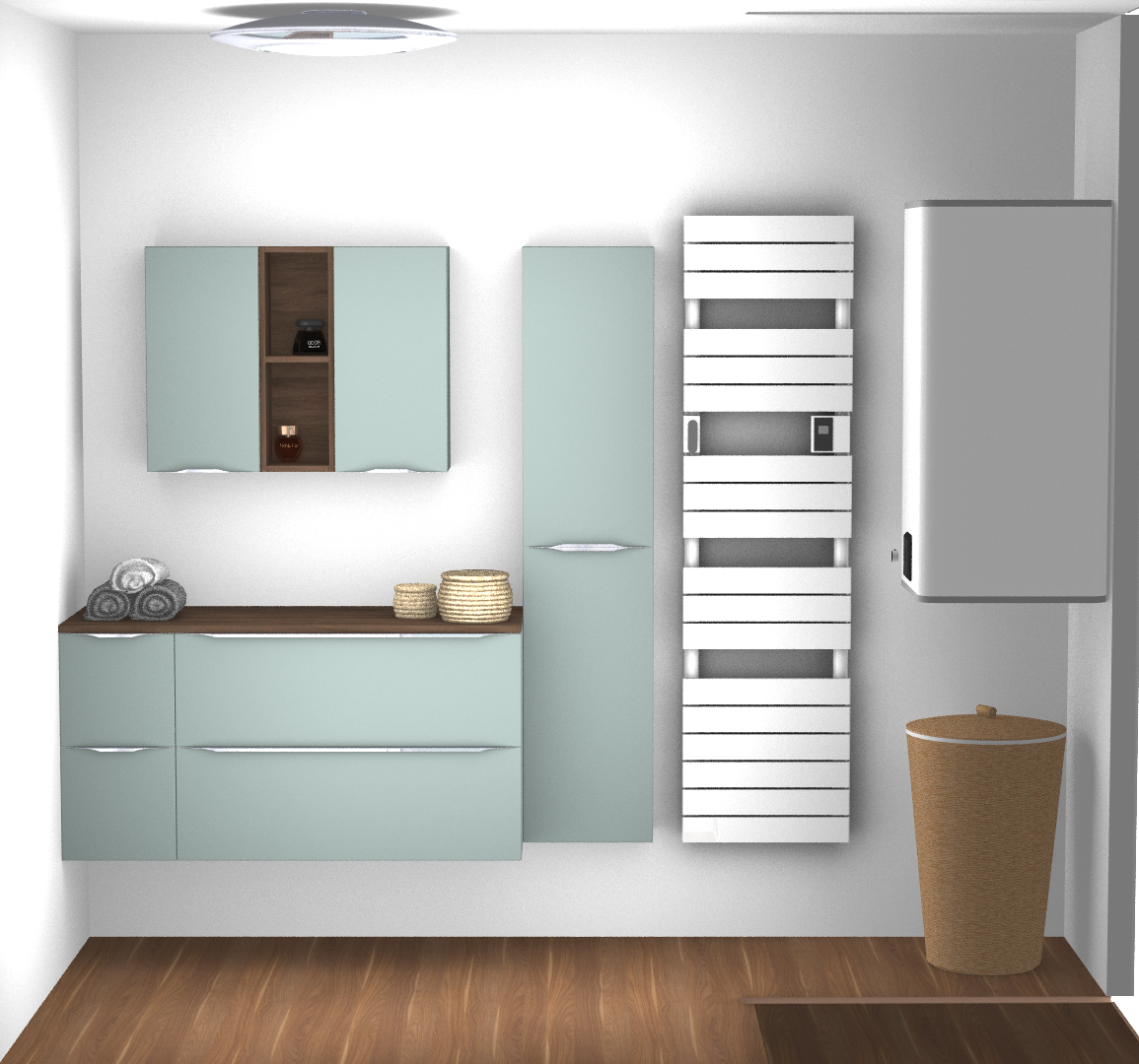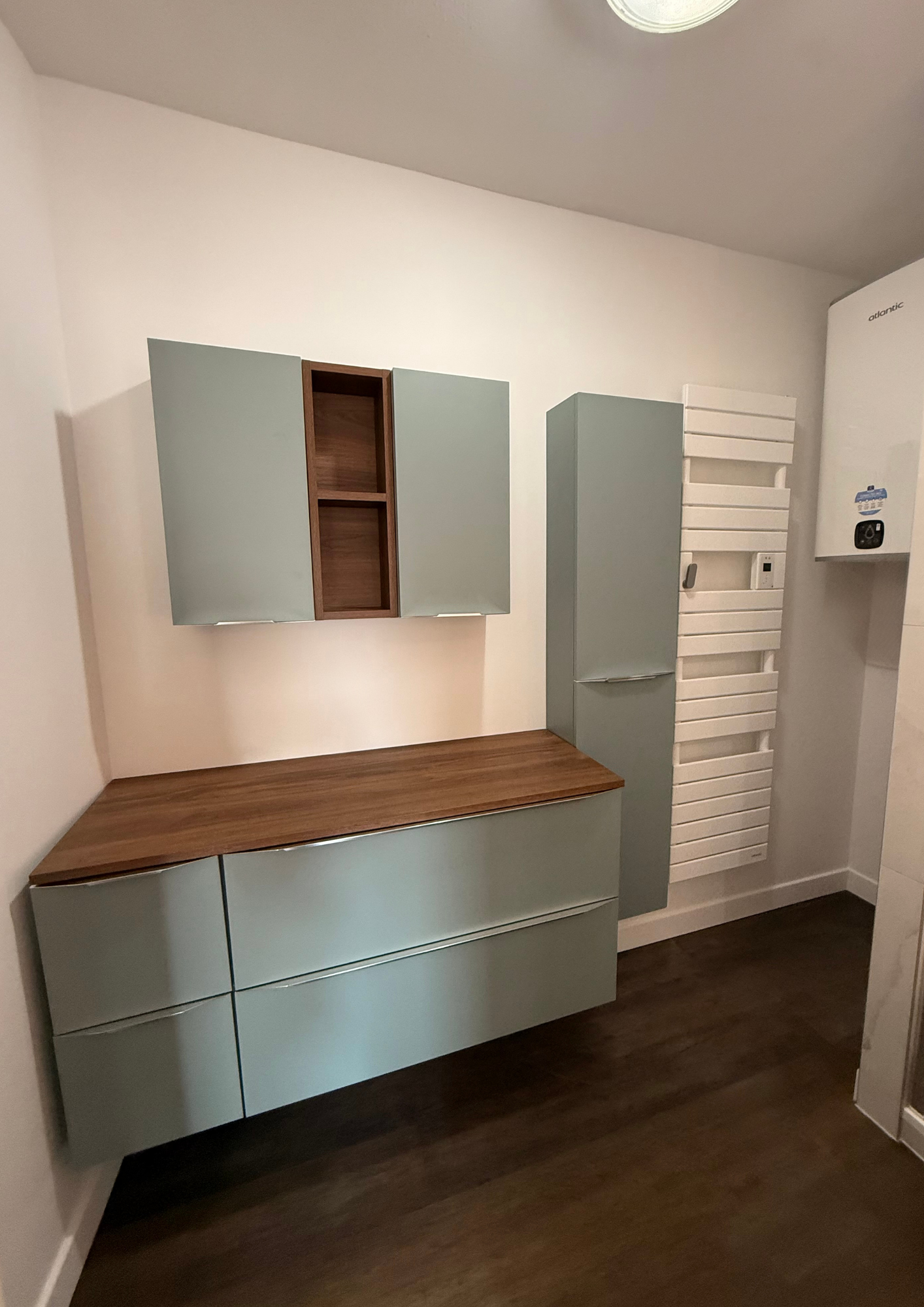 • La pose d’un plan vasque Alterna – Gamme Plénitude en teinte Chêne noisette 120 cm