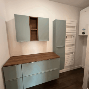 - La pose d’un plan vasque Alterna – Gamme Plénitude en teinte Chêne noisette 120 cm