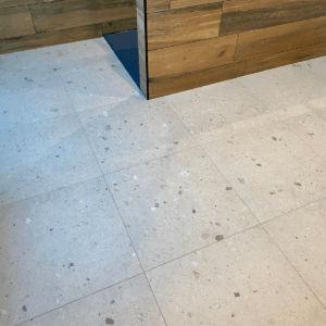 - La pose d’un grès cérame émaillé Emil Group, de la gamme Ego en teinte Avorio de dimensions 60*60 cm