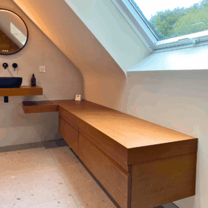 - L’installation de meubles sous plan suspendus Alterna – Gamme Zao Bois – Chêne fumé 90 cm