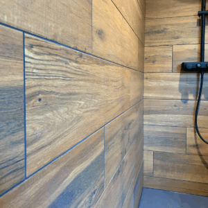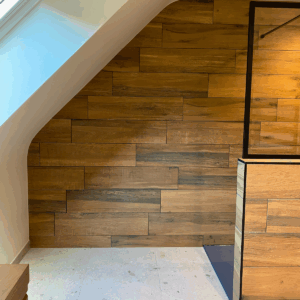- La pose d’une faïence Pavigrés, de la gamme Deepwood en teinte Nut 22,2*89,7