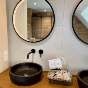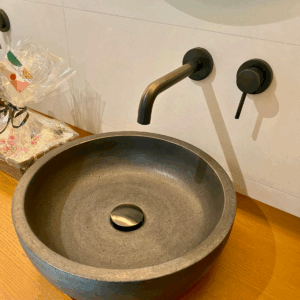 - La pose de vasques Novéaqua – Gamme Ando en pierre de lave – Gris anthracite 40 cm de diamètre