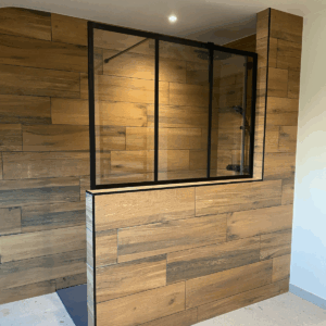 - La pose d’une paroi de douche Alterna Walk – Verrière sur muret – Profilé Noir Mat 140 cm