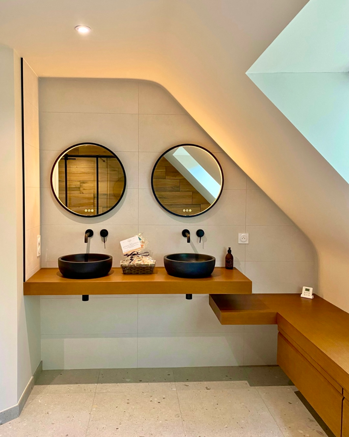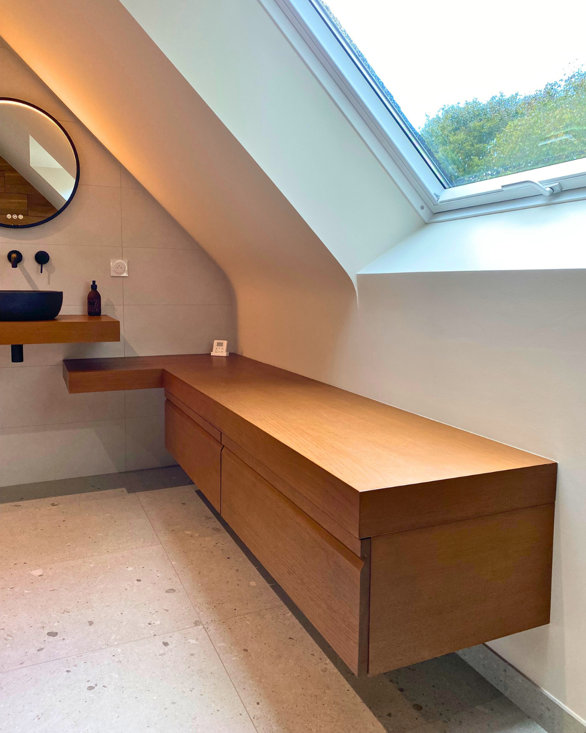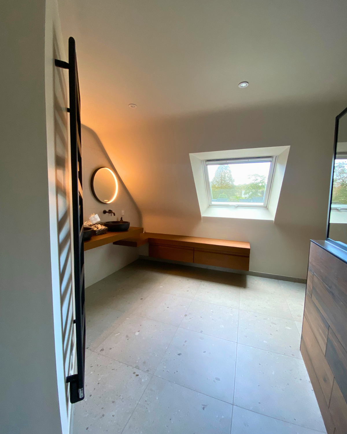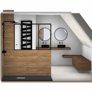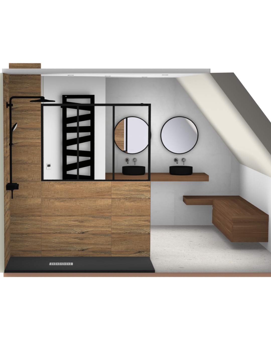 Pour cette rénovation, nous avons réalisé une salle de bains moderne de 14 m² :