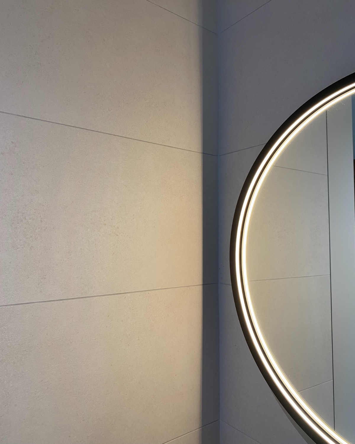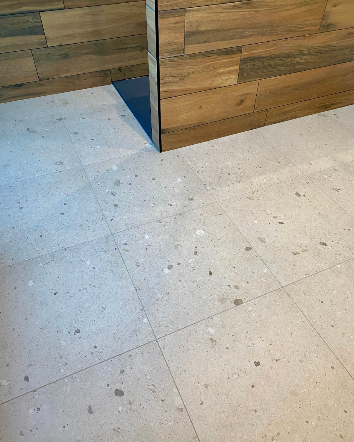 - La pose d’un grès cérame émaillé Emil Group, de la gamme Ego en teinte Avorio de dimensions 60*60 cm
