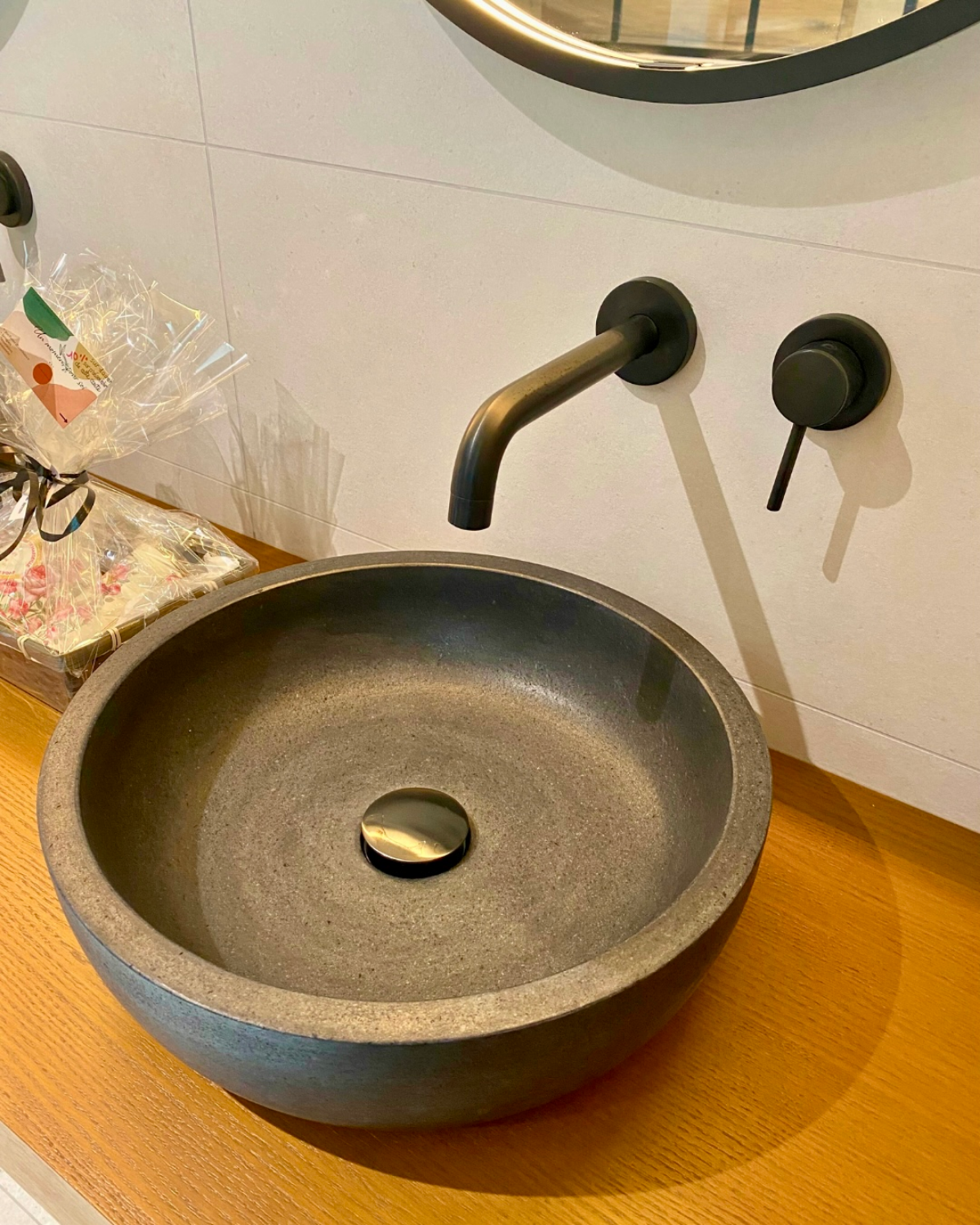 - La pose de vasques Novéaqua – Gamme Ando en pierre de lave – Gris anthracite 40 cm de diamètre