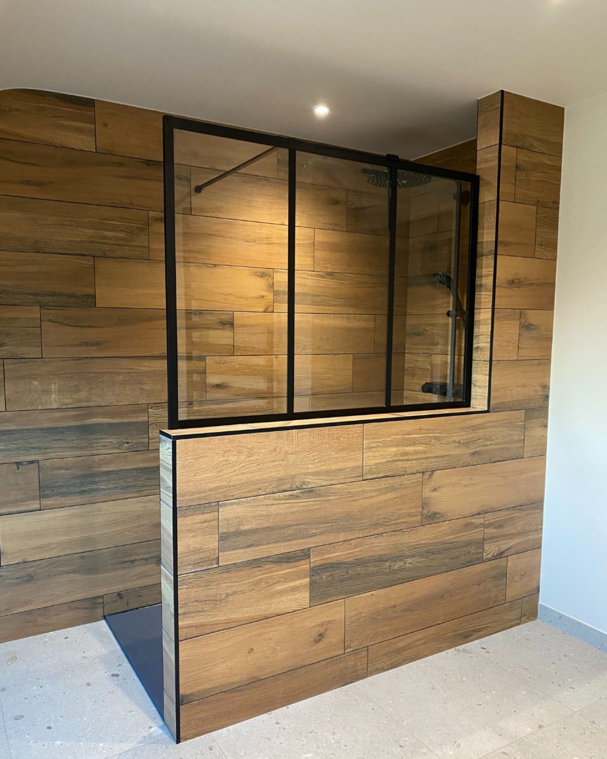 - La pose d’une paroi de douche Alterna Walk – Verrière sur muret – Profilé Noir Mat 140 cm