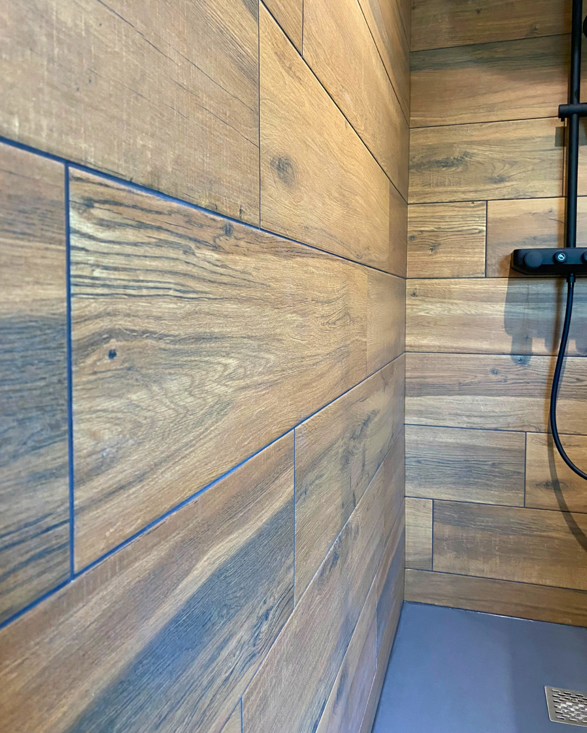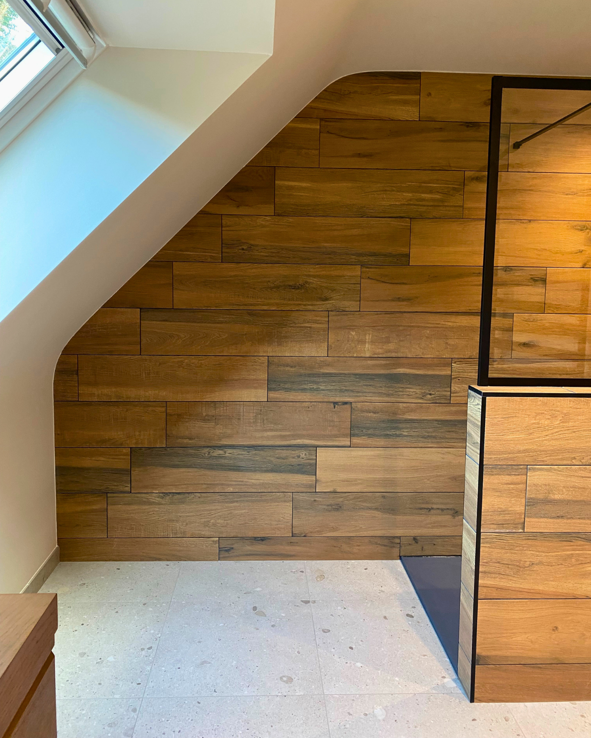 - La pose d’une faïence Pavigrés, de la gamme Deepwood en teinte Nut 22,2*89,7