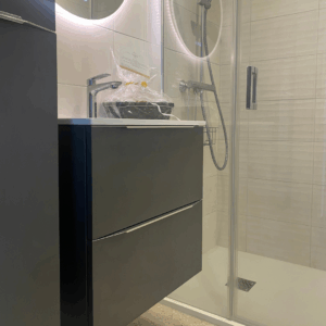- L’installation d’un meuble sous vasque 2 tiroirs Alterna – Gamme Plénitude – Coloris Gris Caviar 60 cm