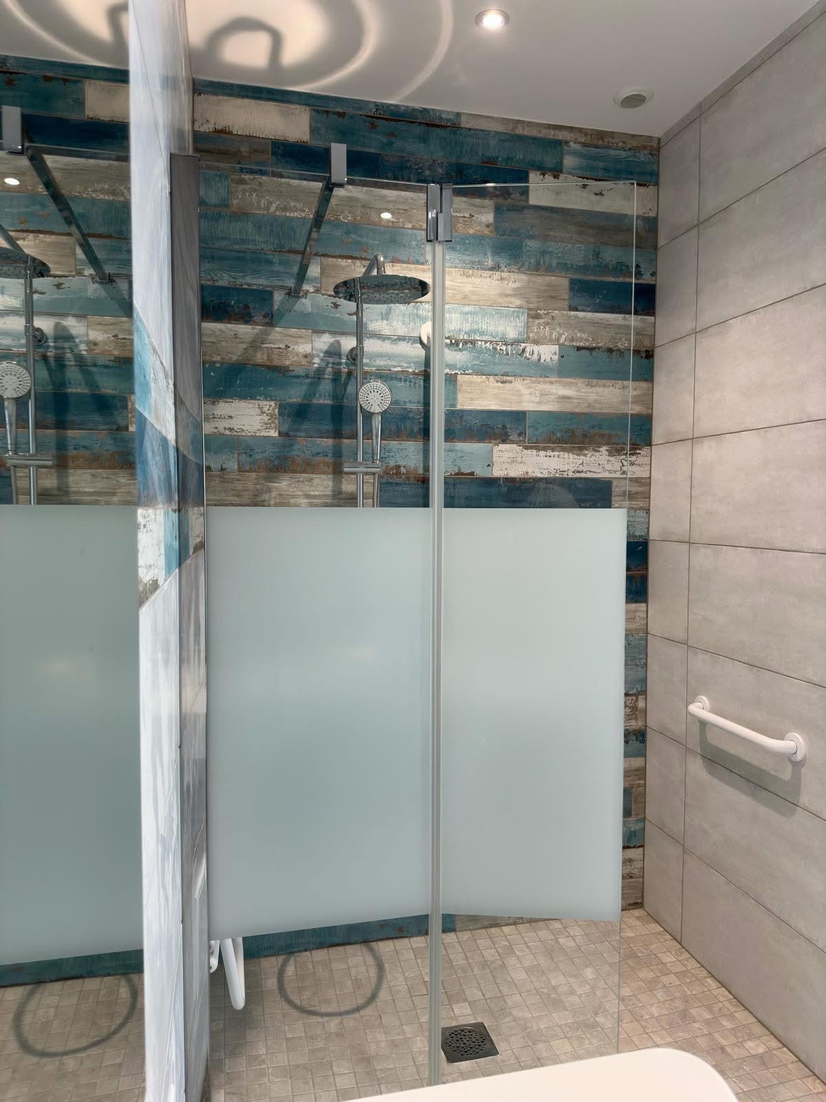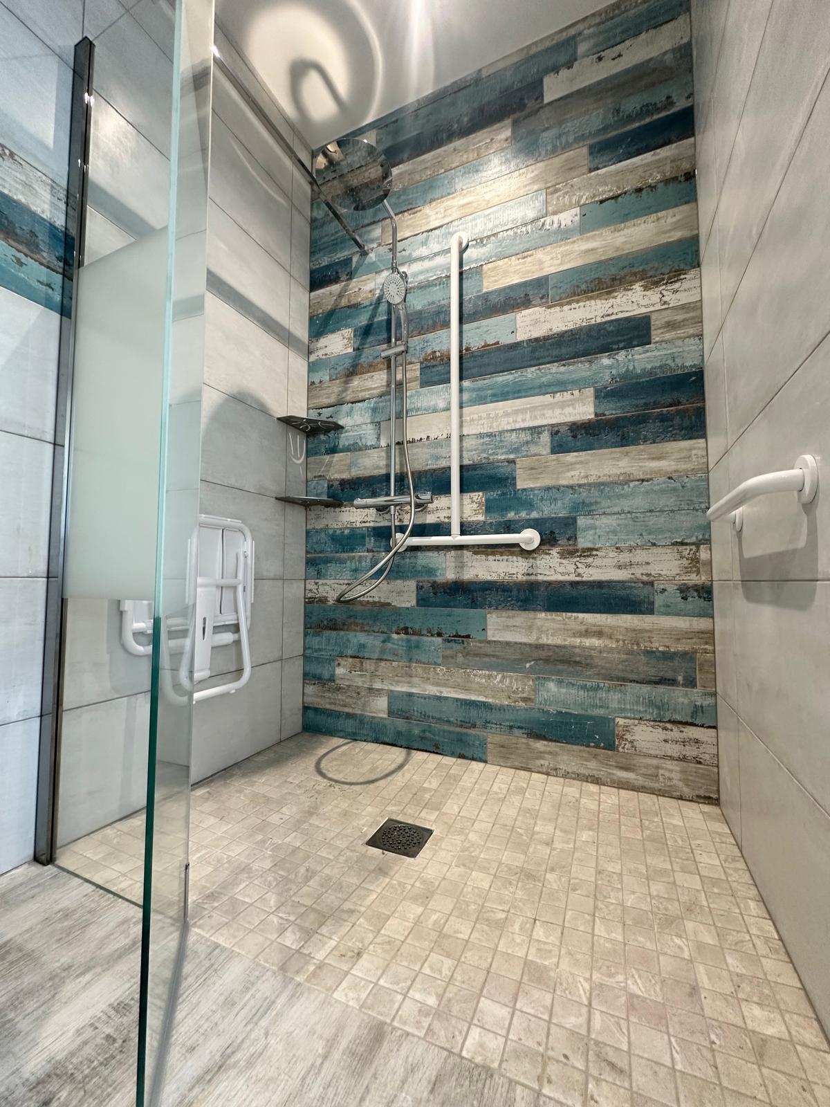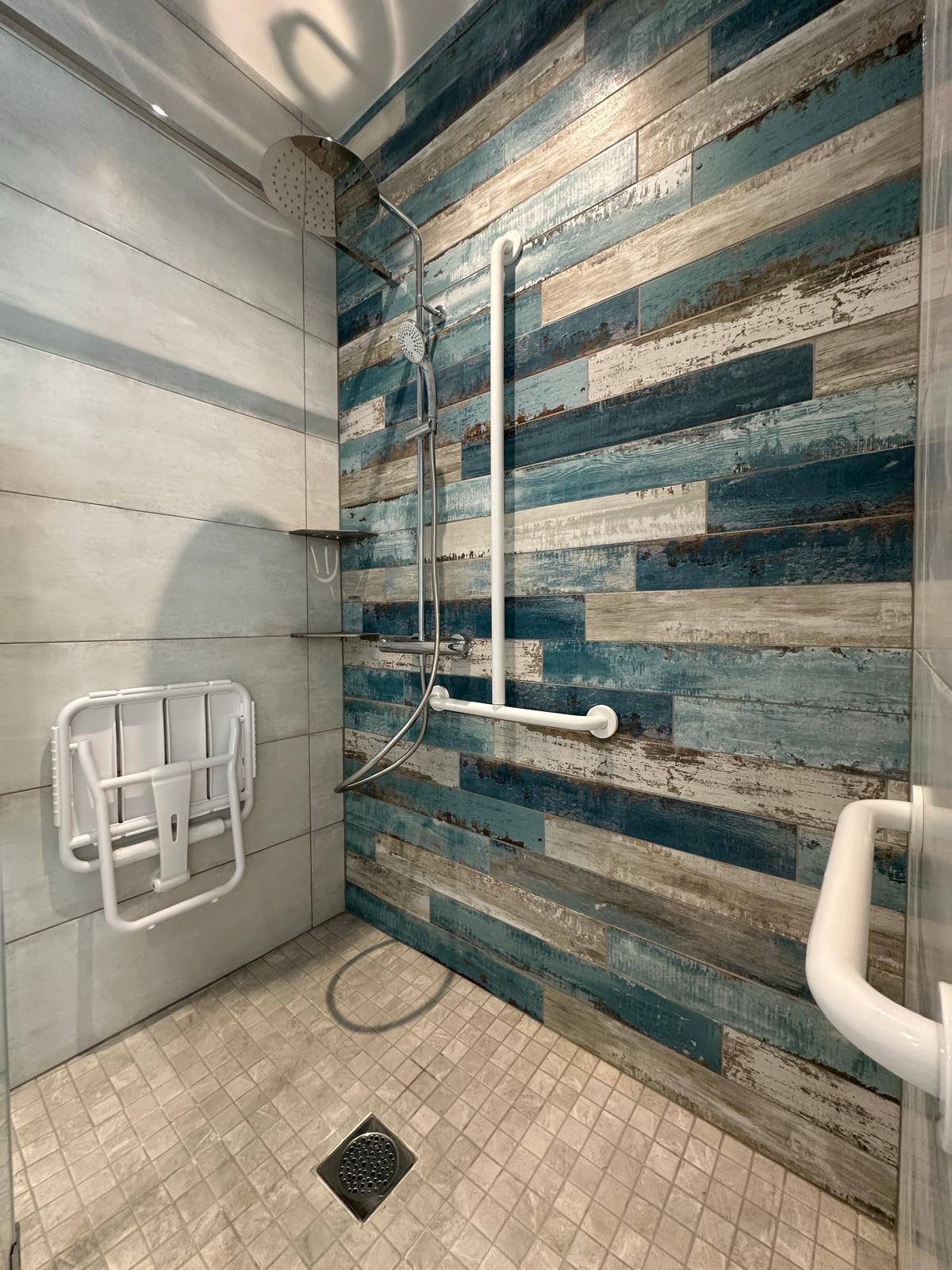 - L’installation d’une barre de maintien coudée à 135° et de deux barres d’appuis de la marque Delabie.