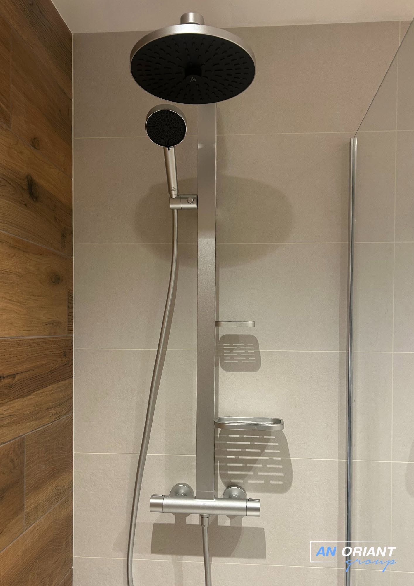 - L’installation d’une colonne de douche thermostatique ALU + Pomme de tête 260mm orientable 2 jets – Douchette 100mm 2 jets en Argent brossé de chez Ideal Standard